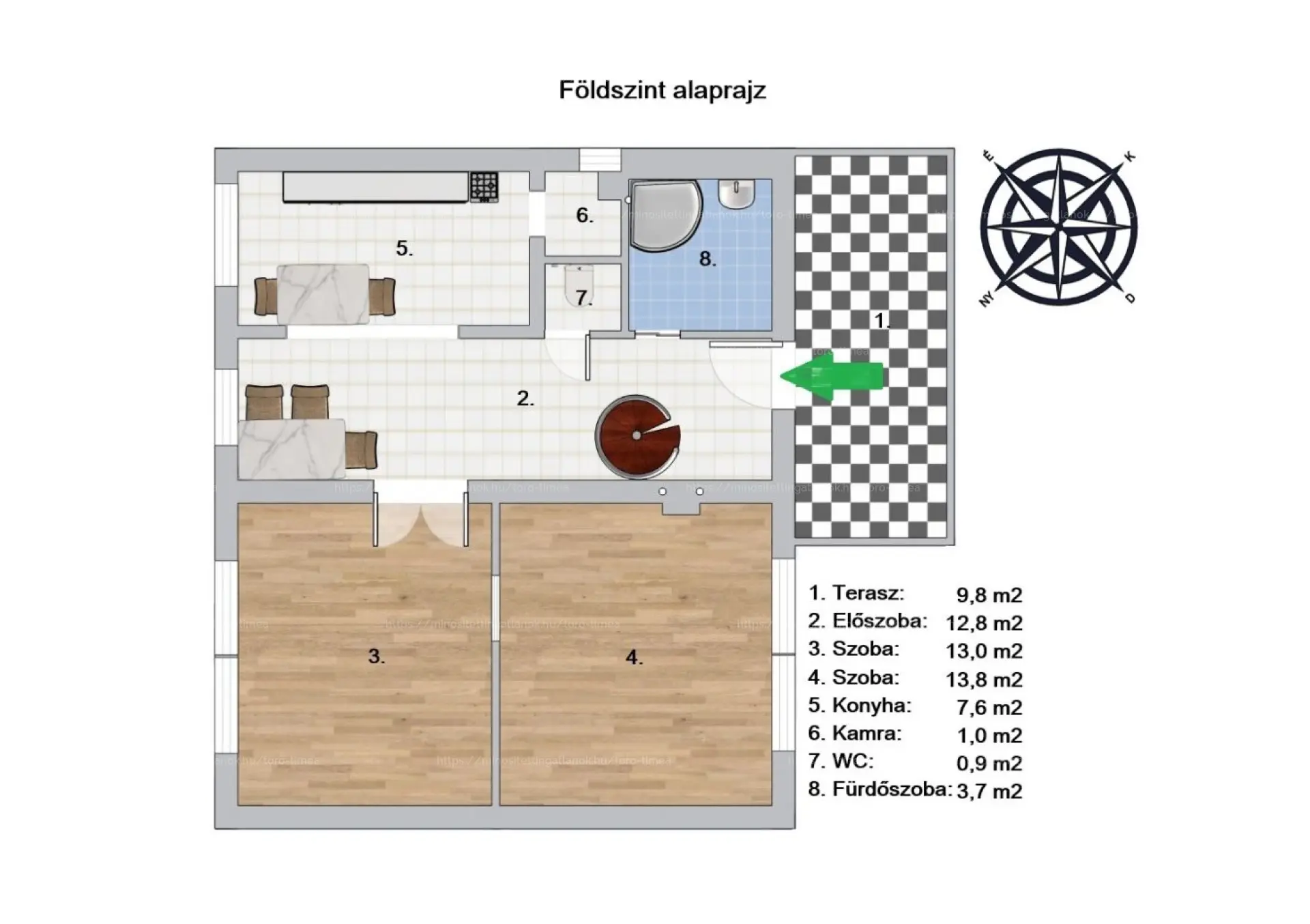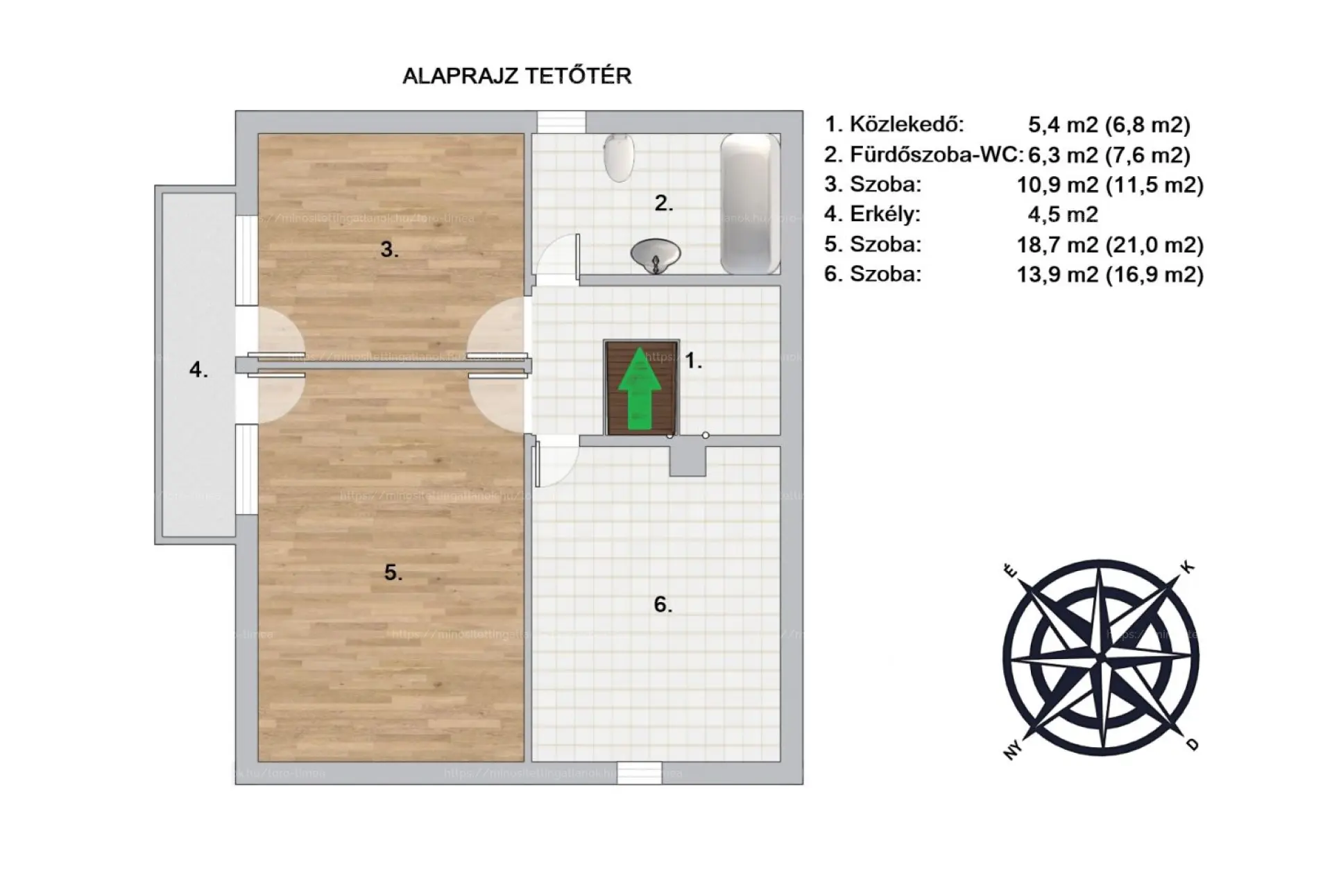 5 szoba, konyha-étkező, 2 fürdő, terasz + erkély