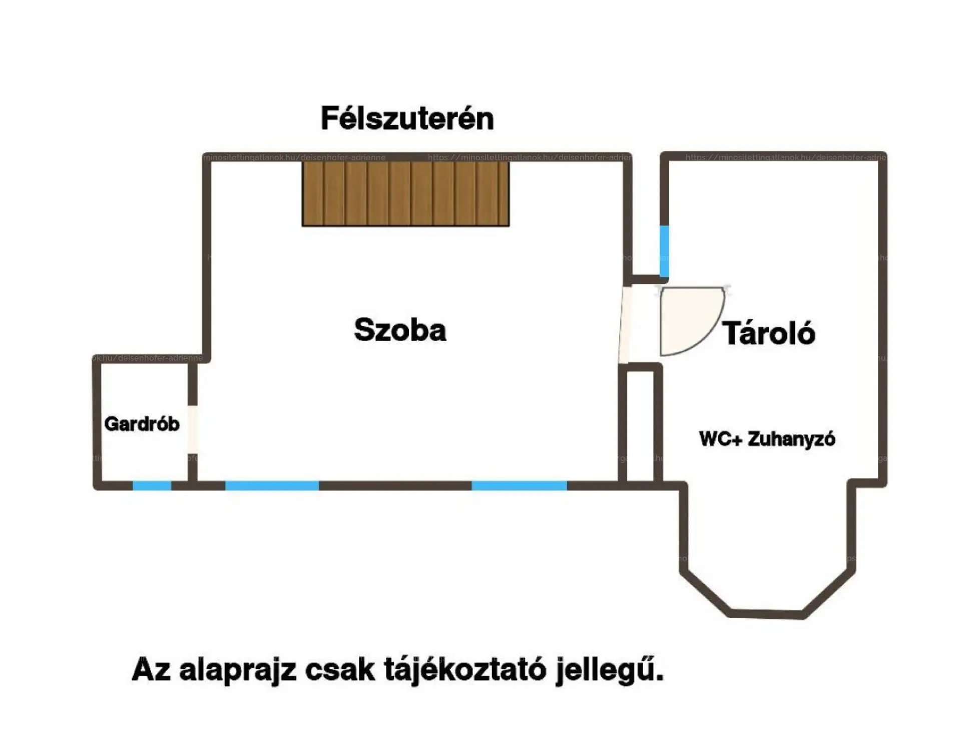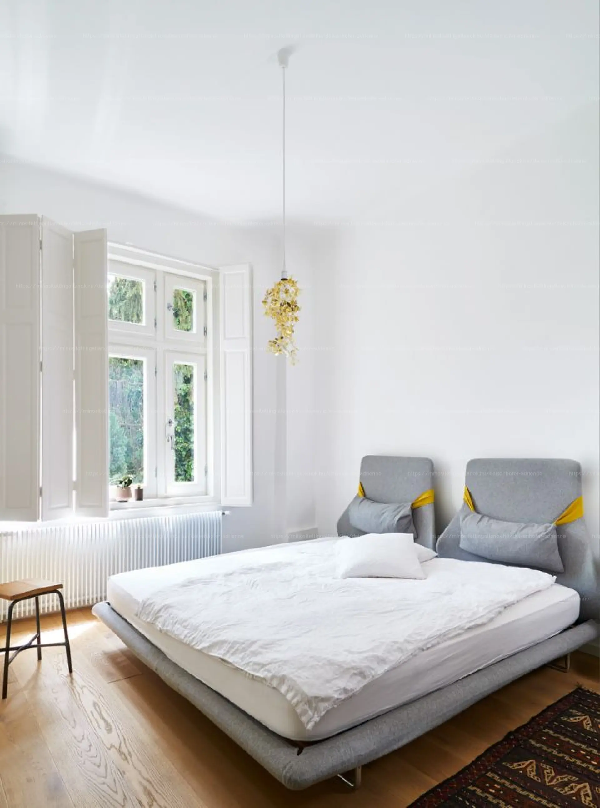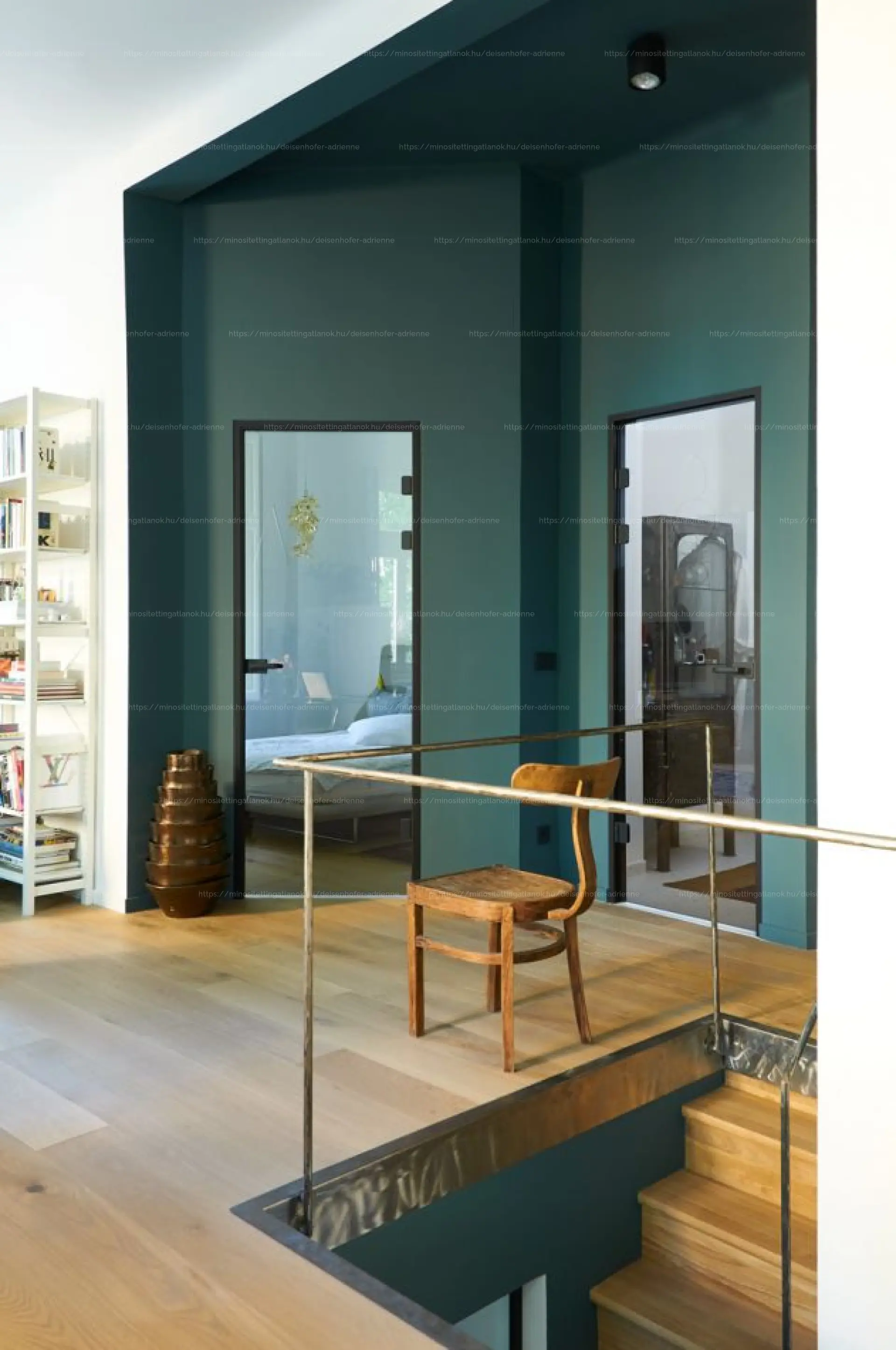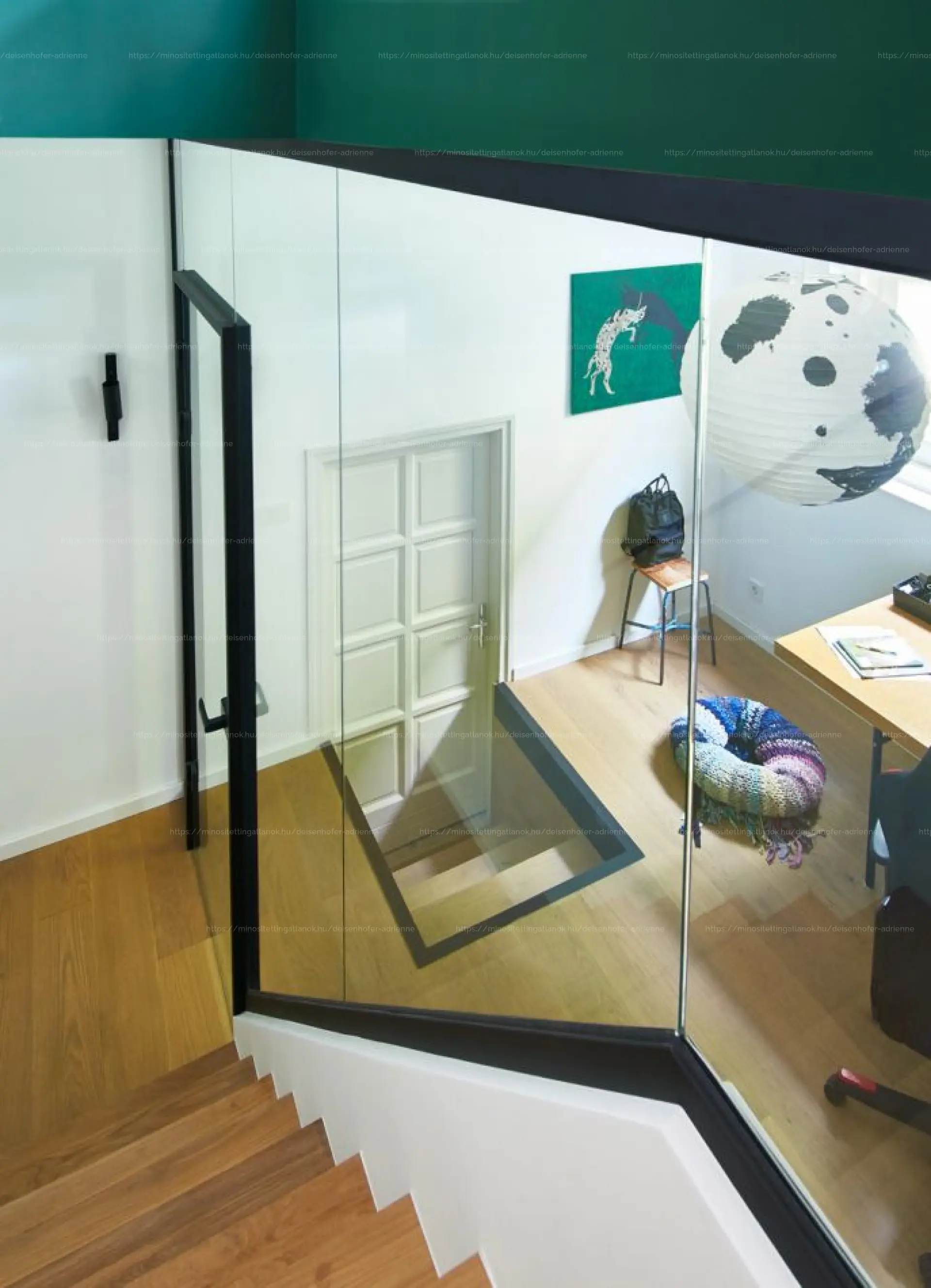 - Alsó szint: kertre néző, 110 cm parapetmagasságú ablakok, hálószoba, külön gardrób és mosóhelyiség, 2,70 m belmagasság.