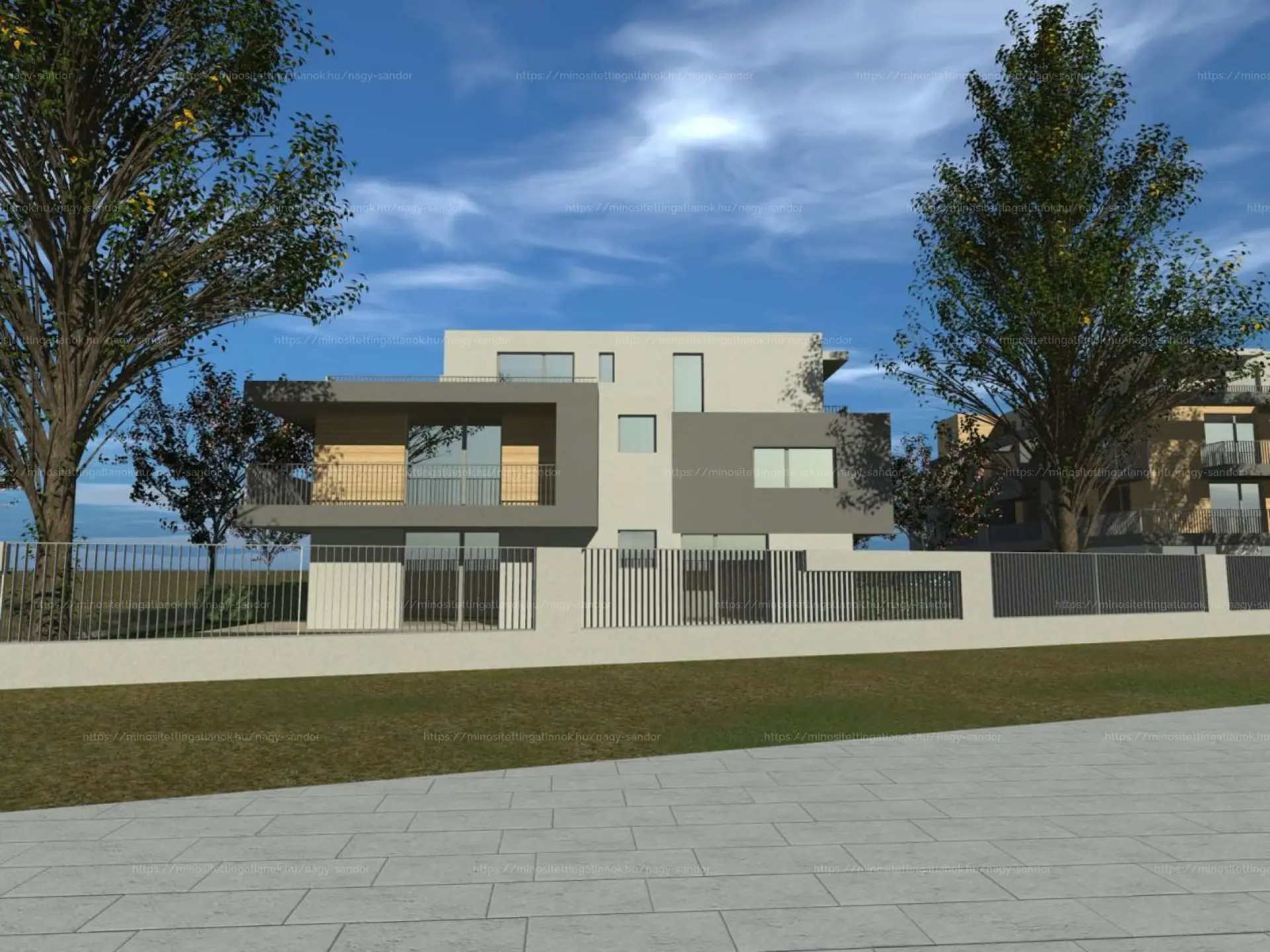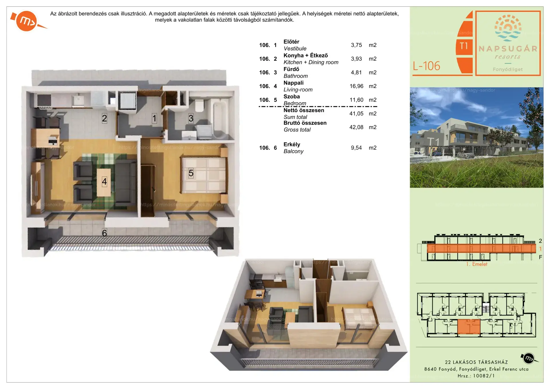Fonyódliget Erkel Ferenc utca 12. szám alatt épülő 22 lakásos társasházban (tervezett átadás 2026. május) eladó egy I. emeleti 42 m2 + 9,5 m2 terasz alapterületű lakás (nappali + 1 háló). Gépkocsi beálló ára 3 millió Ft. Árpád parttól 200 méterre!!!
