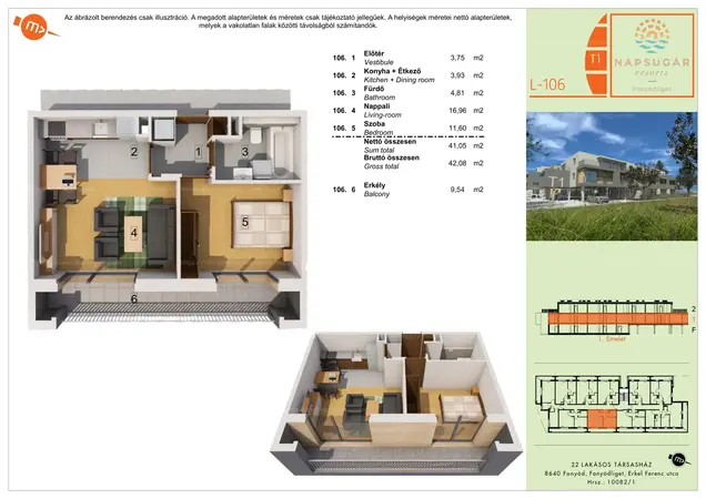 Fonyódliget Erkel Ferenc utca 12. szám alatt épülő 22 lakásos társasházban (tervezett átadás 2026. május) eladó egy I. emeleti 42 m2 + 9,5 m2 terasz alapterületű lakás (nappali + 1 háló). Gépkocsi beálló ára 3 millió Ft. Árpád parttól 200 méterre!!!