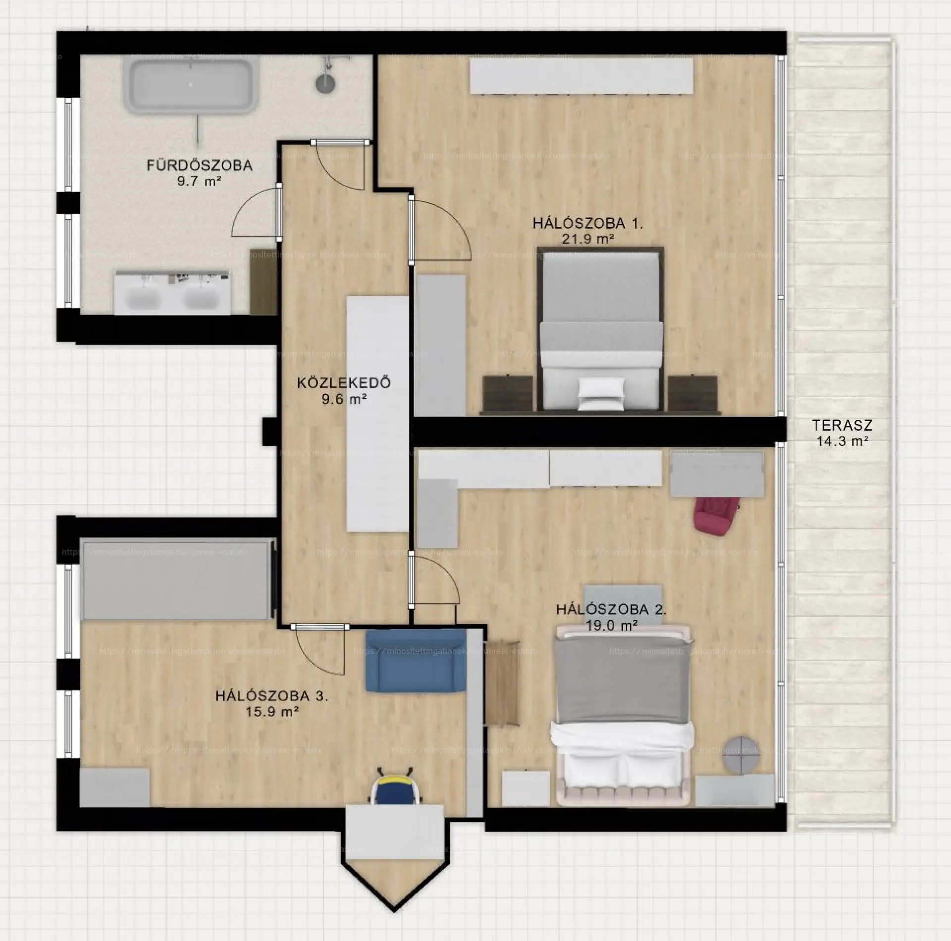 - Nappali + étkező + 3 háló + 2 fürdő + külön WC