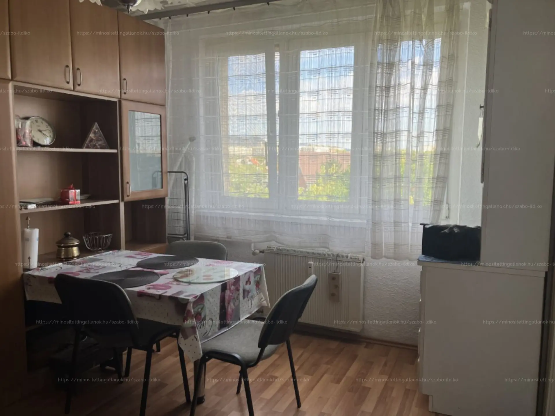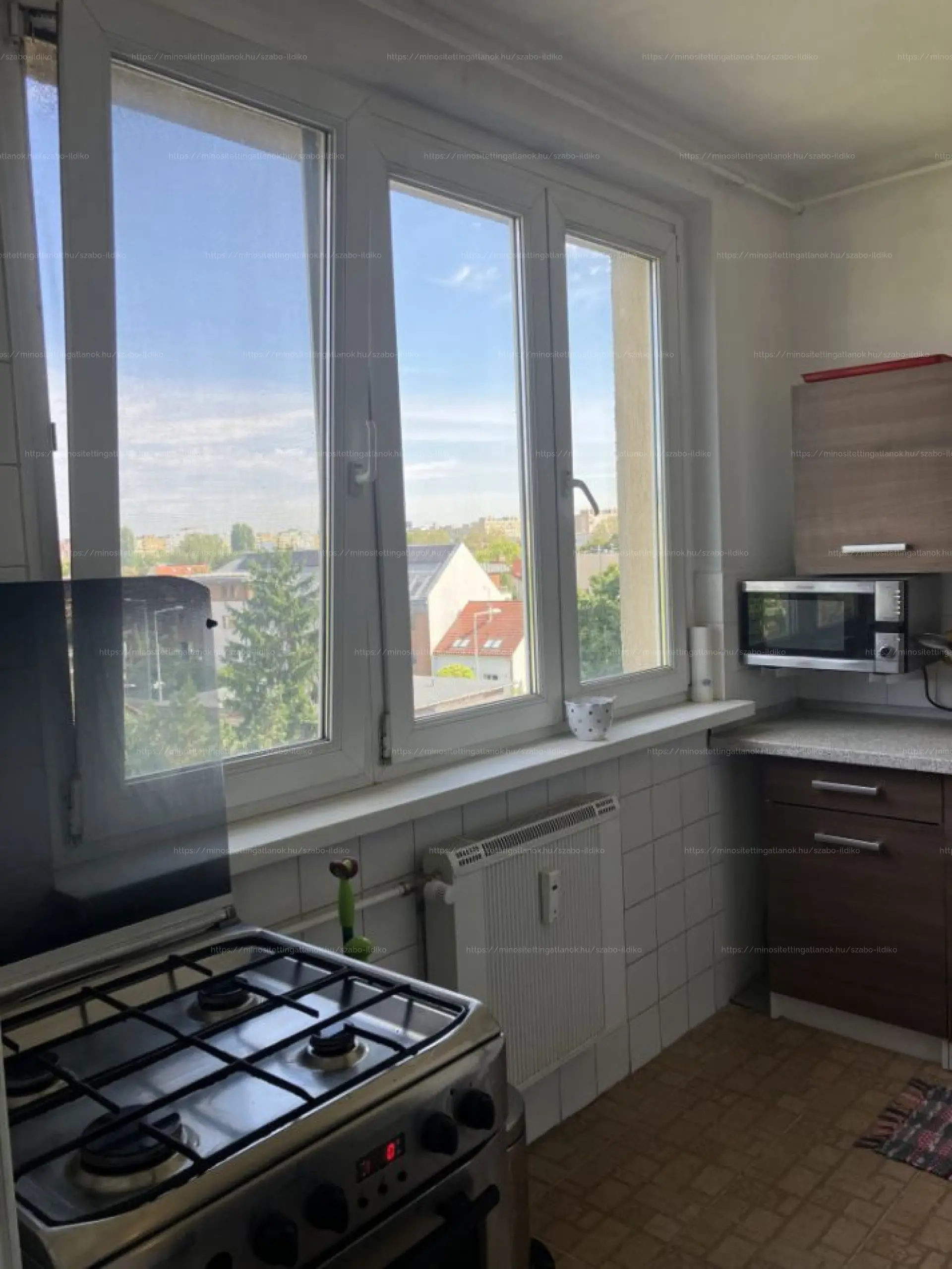 A nappali déli fekvésű, napfényes, 18 m2 alapterületű, innen nyílik az erkély. A konyha nagy ablakos, beépített konyhabútorral, kombinált gáz tűzhellyel felszerelve, járólappal burkolt. Innen nyílik a szintén csendes utcára néző 12,5 m2 alapterületű szoba beépített szekrény sorral. A fürdőszoba mosdóval, káddal felszerelt, a toalett külön helységben kapott helyet. Az előszobában és a közlekedőben beépített szekrények kerültek beépítésre. A meleg vízről és az otthon melegéről a távhő gondoskodik, hőmennyiség mérővel és vízórával felszerelt lakás. Az ablakok három légkamrás műanyag ablakokra lettek cserélve.