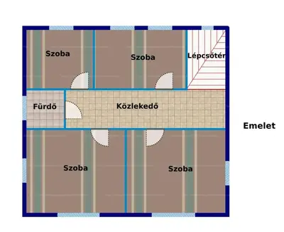 Az emeleten négy szoba, egy közlekedő és egy fürdőszoba helyezkedik el.