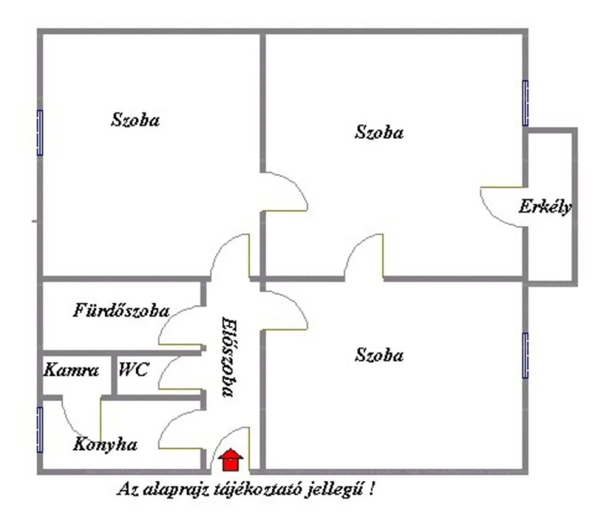 A társasház lépcsőháza tiszta rendezett, a lakás az első emeleten helyezkedik el alapterülete 71 nm, mely az alábbi helyiségekre osztott: előszoba ,három külön bejáratú szoba,- amelyek egybe is nyílnak-, konyha, kamra, fürdőszoba, WC ,utóbbiak külön helyiségben találhatóak.