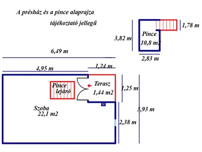 A különálló épületben található 22 m2 présházban az épületből megközelíthető 10,8 m2 nagyságú pince található. A présház saját egyfázisú áram-bekötéssel rendelkezik (1x16 A).