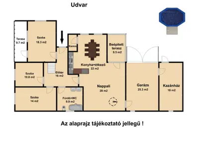 Alapterület 170 m², öt szoba, plusz amerikai konyhás nappali.