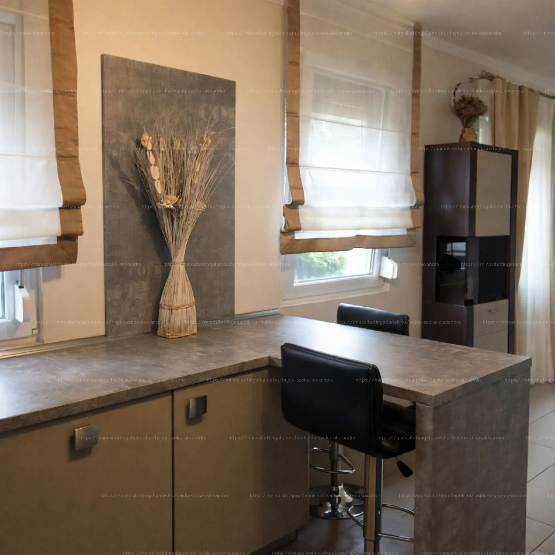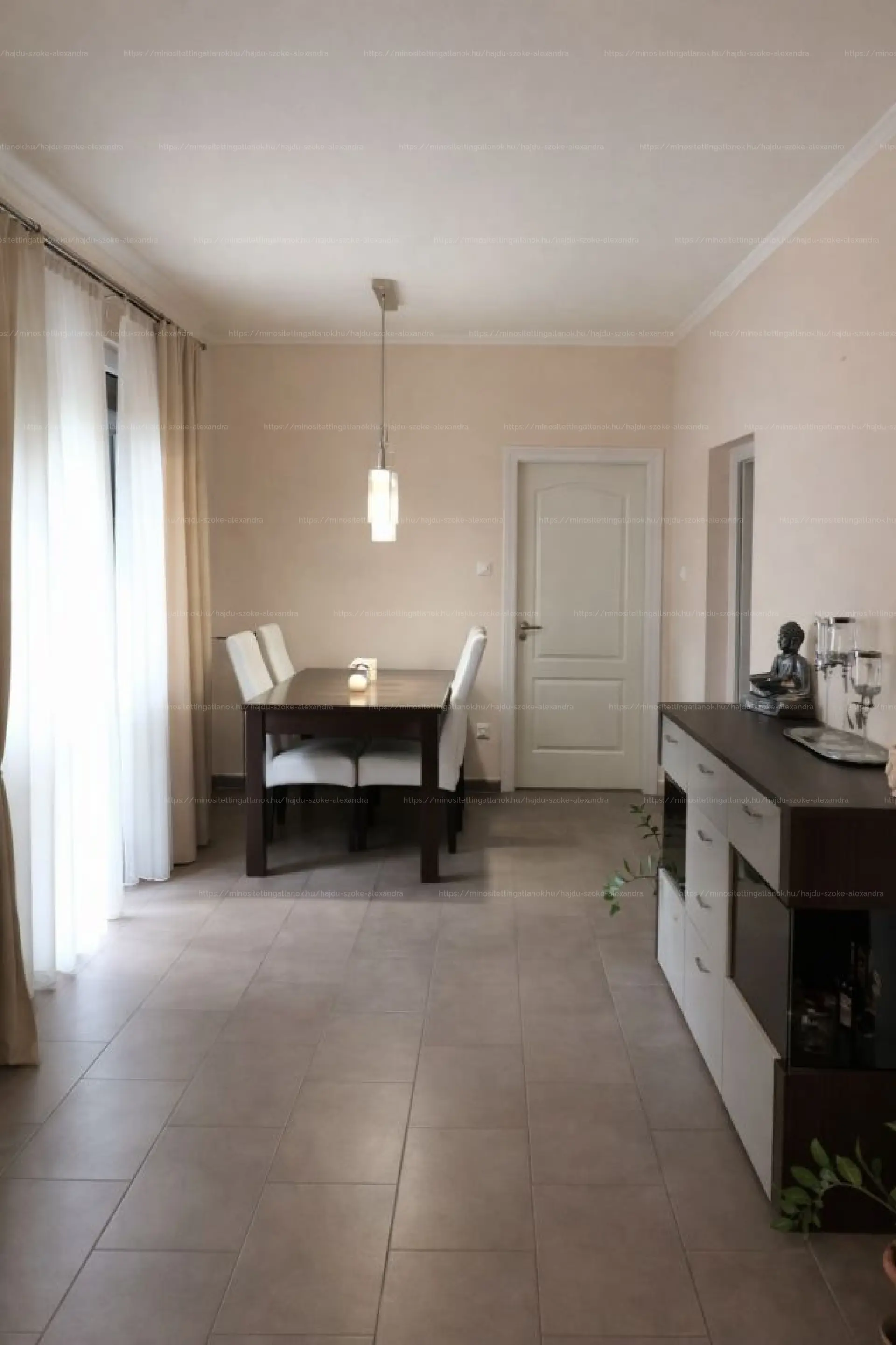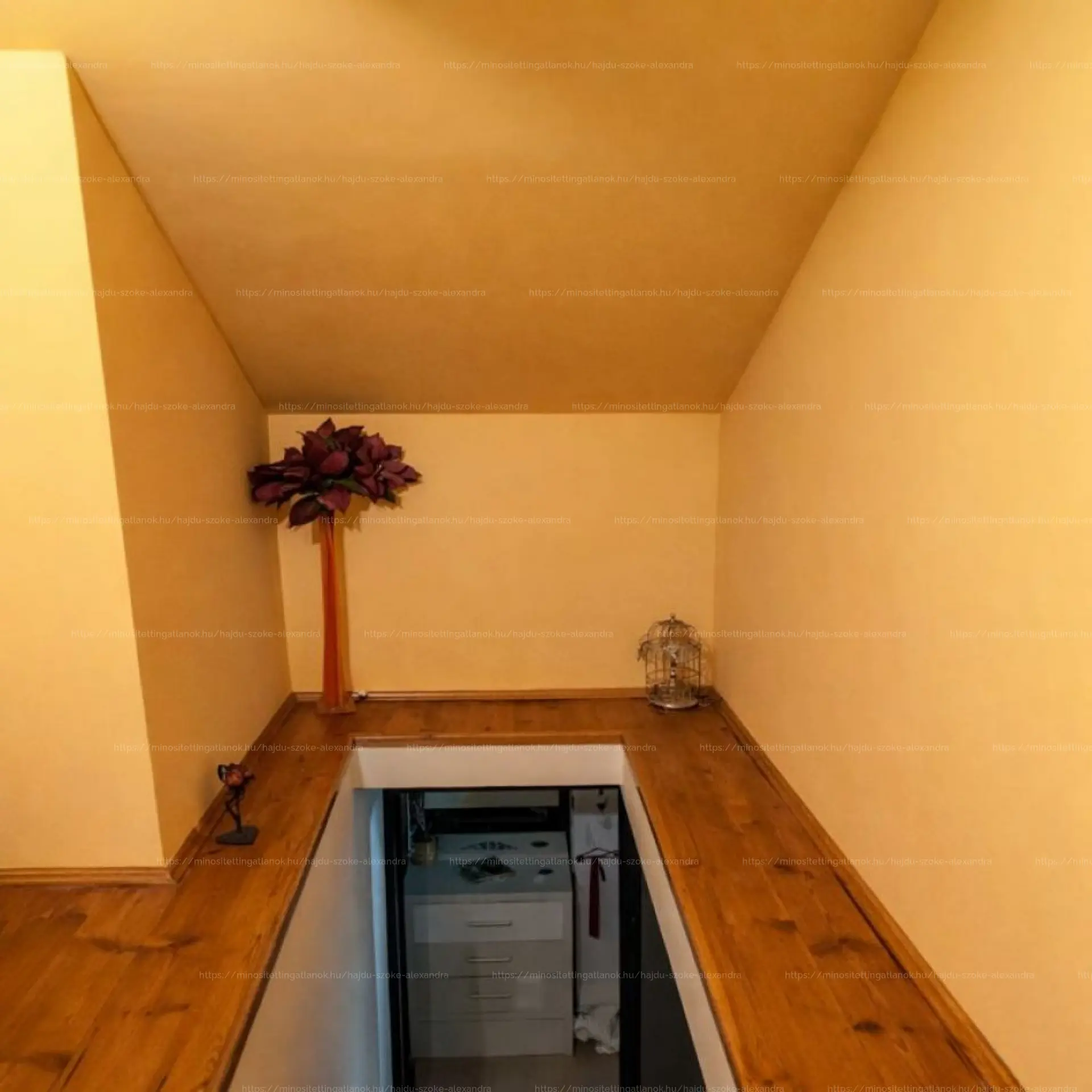 Az előszobából egy külön lakrész nyílik (hálószoba, nappali, fürdőszoba), valamint mosókonyha, vendég WC és lépcső vezet fel az emeletre, ahol 2 tágas szoba található. A földszinten egy 20 m²-es nappali, étkező-konyha, 2 hálószoba és egy fürdőszoba szolgálja a lakók kényelmét. Az étkezőből közvetlen kijárat nyílik a 25 m²-es rusztikus stílusú teraszra.