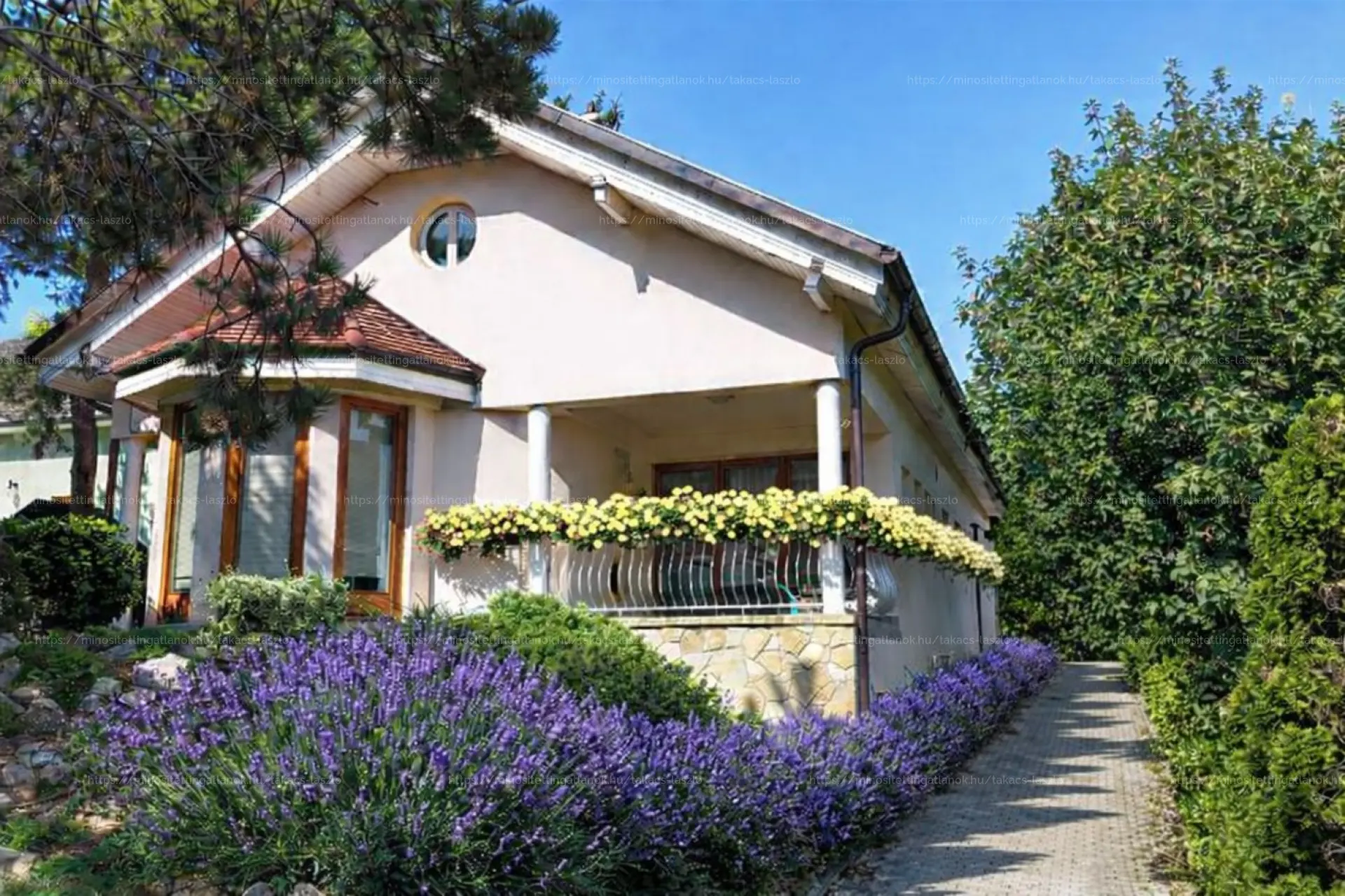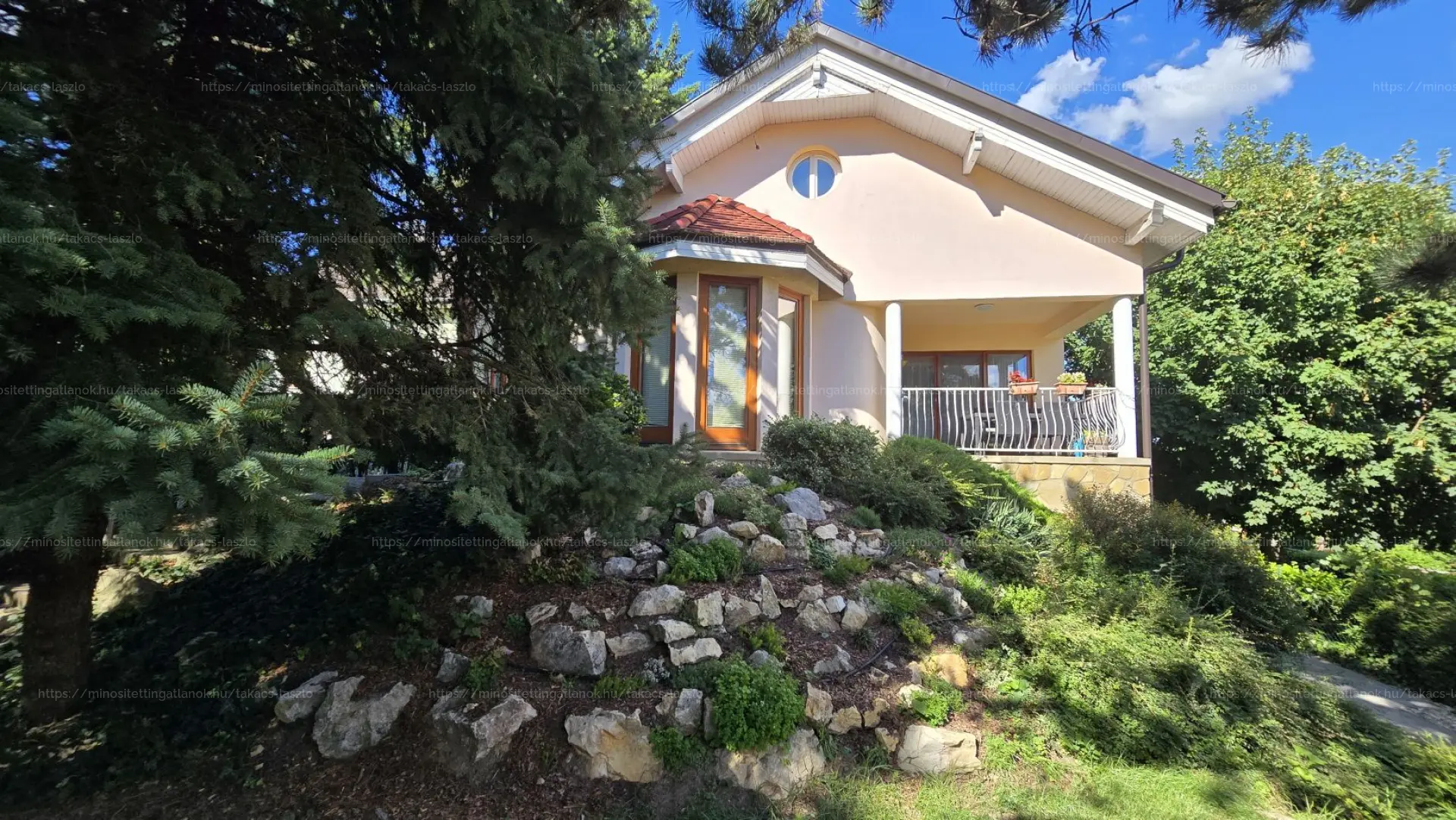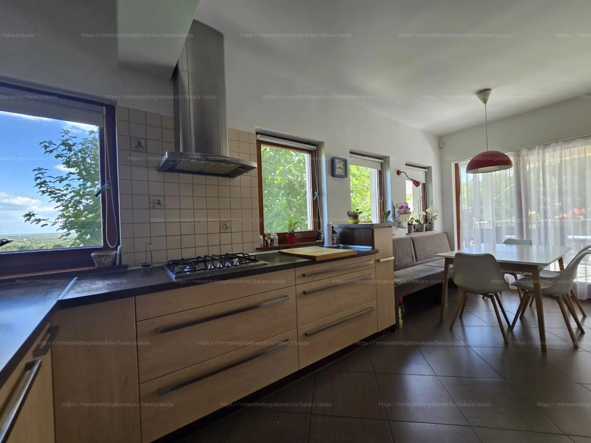 Beosztása rendkívül praktikus és élhető: a ház központi tere a nagy nappali, melyhez egy átjárón keresztül kapcsolódik a konyha és étkező együttese. Az étkezőből egy fedett teraszra juthatunk, mely tökéletes helyszíne a reggeli kávézásnak, nyár esti beszélgetéseknek. A földszinten még két hálószoba található, a köztük lévő közlekedőből nyílik az oldalsó, nyitott, fantasztikus panorámával rendelkező másik terasz. Továbbá fürdőszoba, gardrób, külön WC és előszoba került kialakításra ezen a szinten. Az emelet elrendezése: két hálószoba és egy tágas fürdőszoba WC-vel. A félszuterén szinten a kiszolgáló helyiségek vannak, tárolók, kamra és egy háztartási helyiség, mely egyben kazánház is, ill. a közel 35 nm-es garázs. Az egyik tároló külön közvetlen kijárattal rendelkezik a kert felé, ezért akár önálló lakrészként, irodaként is funkcionálhat.