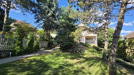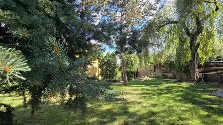 A 617 nm-es kert ÉK-DNY tájolású, enyhén lejtős, szépen parkosított örökzöld növényekkel és egy terebélyes fűzfával.