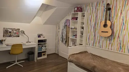 Az ingatlan tökéletes helyen van, tágas terei és a négy hálószoba egy nagyobb család számára is kényelmes lakhatást biztosít, az autók dupla garázsban parkolhatnak, a félszuterén szint pedig kiváló lehetőség tárolásra, vagy egyéb funkciók ellátására (konditerem, iroda, vendégszoba stb.).