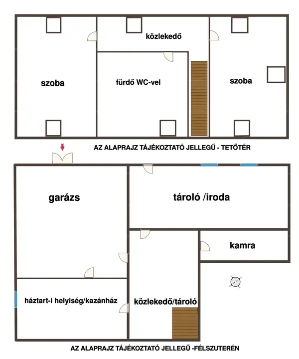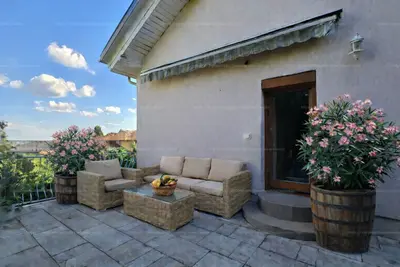 Beosztása rendkívül praktikus és élhető: a ház központi tere a nagy nappali, melyhez egy átjárón keresztül kapcsolódik a konyha és étkező együttese. Az étkezőből egy fedett teraszra juthatunk, mely tökéletes helyszíne a reggeli kávézásnak, nyár esti beszélgetéseknek. A földszinten még két hálószoba található, a köztük lévő közlekedőből nyílik az oldalsó, nyitott, fantasztikus panorámával rendelkező másik terasz. Továbbá fürdőszoba, gardrób, külön WC és előszoba került kialakításra ezen a szinten. Az emelet elrendezése: két hálószoba és egy tágas fürdőszoba WC-vel. A félszuterén szinten a kiszolgáló helyiségek vannak, tárolók, kamra és egy háztartási helyiség, mely egyben kazánház is, ill. a közel 35 nm-es garázs. Az egyik tároló külön közvetlen kijárattal rendelkezik a kert felé, ezért akár önálló lakrészként, irodaként is funkcionálhat.