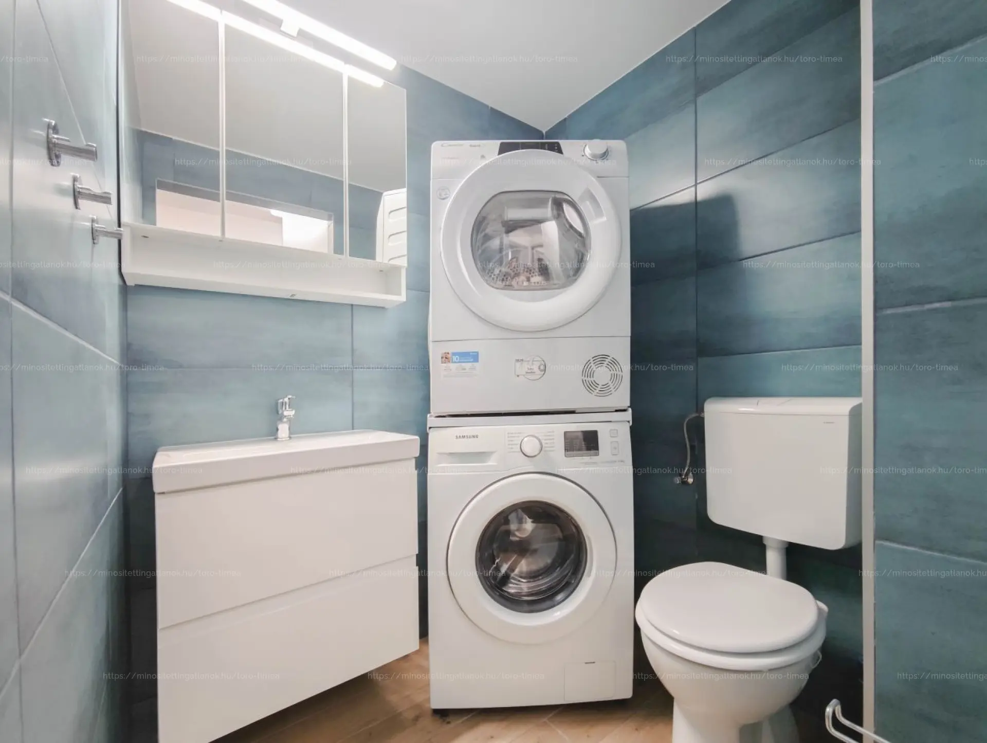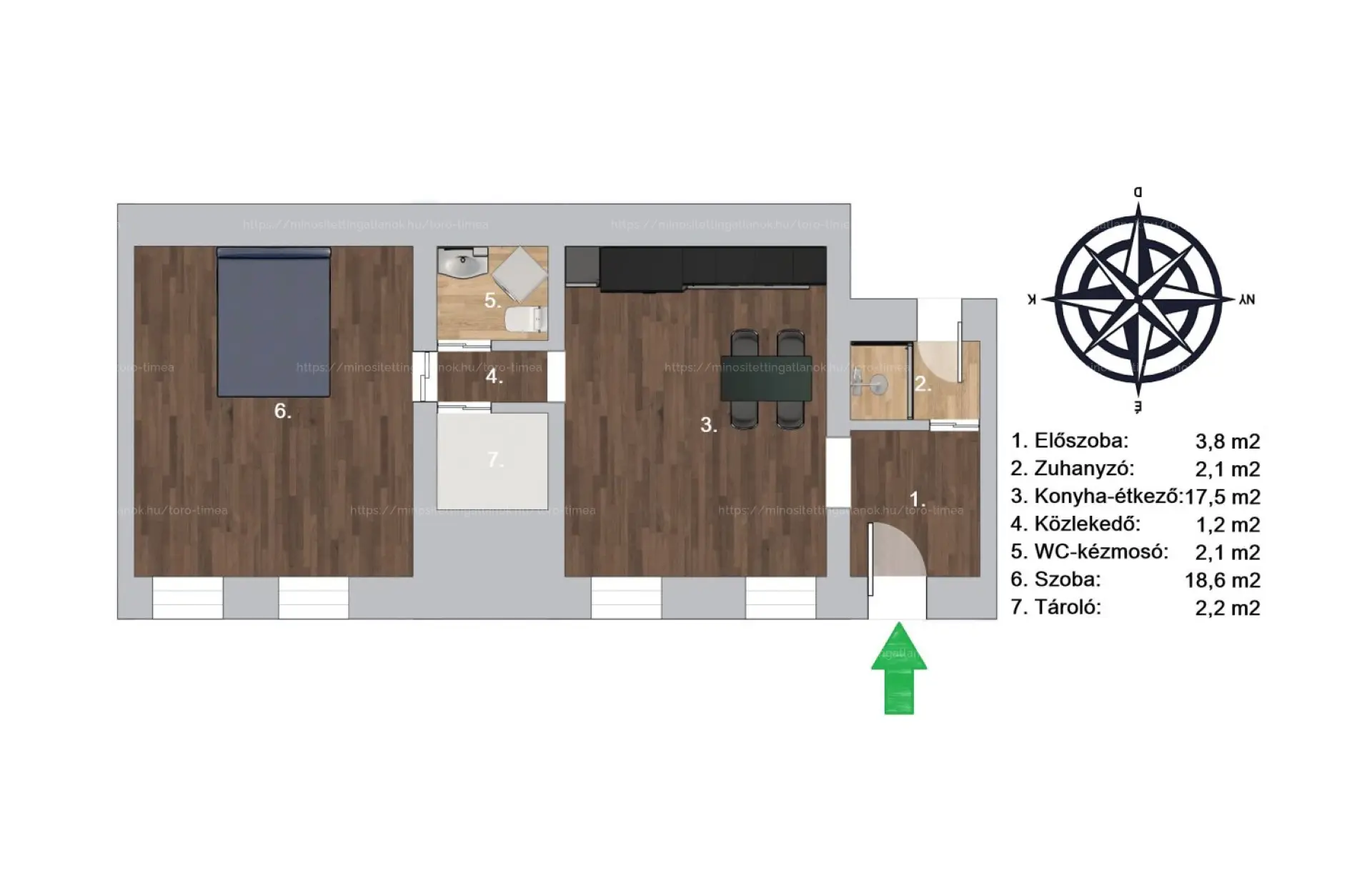 Praktikus elrendezés: előszoba, nappali–konyha–étkező, háló, zuhanyzó, wc–mosókonyha