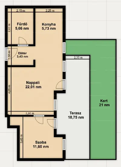 A lakás kiváló elrendezésű: a tágas, amerikai konyhás nappali mellett külön nyíló hálószoba és fürdőszoba WC-vel is megtalálható. A terasz mind a nappaliból, mind a hálóból megközelíthető, így a belső terek természetes kapcsolatban vannak a kerttel.