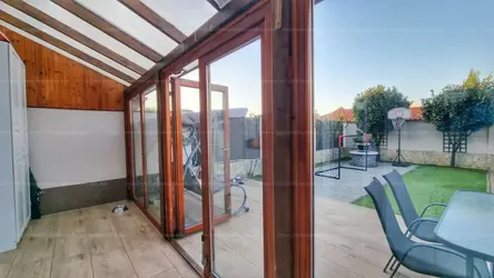 A nappaliból közvetlenül a hangulatos télikertbe léphetünk, ahonnan elérhető a műfűvel borított, intim pihenőkert – kiváló helyszíne családi vagy baráti összejöveteleknek.
