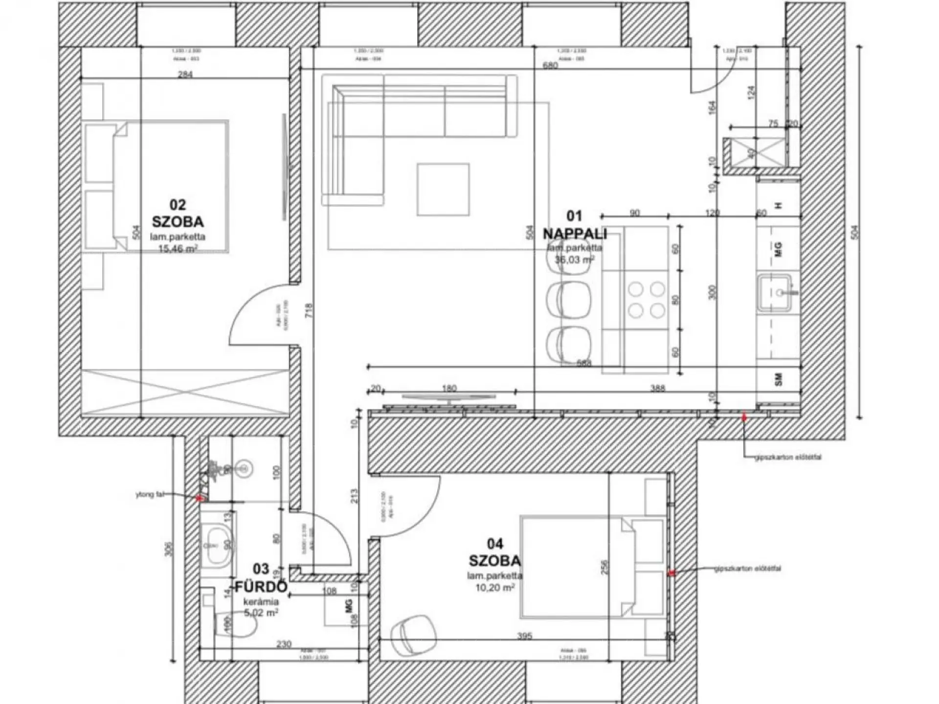 - Nappali + 2 hálószoba + fürdő