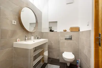 ✨ A csendes lakás földszinti, az ablakok a belső udvarra néznek. Az előtérből balra nyílik a konyha, itt található egy kis tároló, a fürdőszoba zuhanyzós, a szobák egymásból nyílnak. A konyhában és az előtérben padlófűtés van, a fürdőszobában és a szobákban elektromos fűtőpanelek. A vastag falak nagyon jól szigetelnek. A meleg vizet villanybojler biztosítja; vezérelt mérőóráról, azaz kedvezményes tarifával.