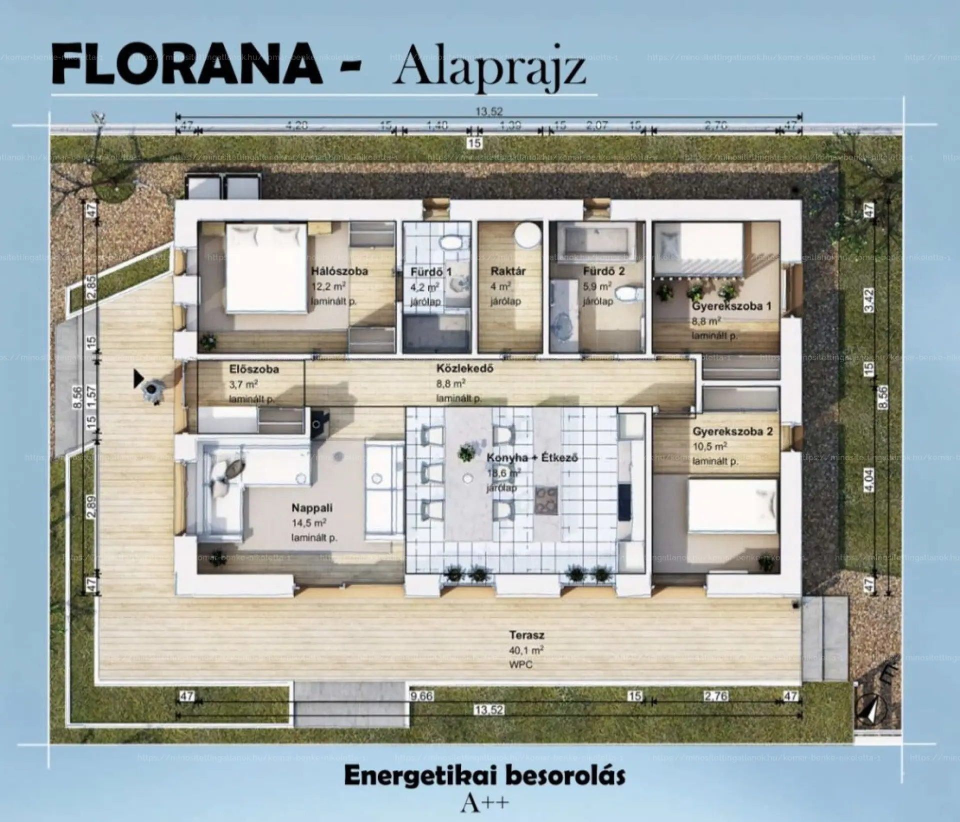 A ház egy 826 m²-es telekre épül, és mindössze 6 hónap alatt kulcsrakészen átadásra kerül. A modern hőszivattyús rendszer, a padlófűtés és a kiemelkedő hőszigetelés garantálja a gazdaságos fenntartást.