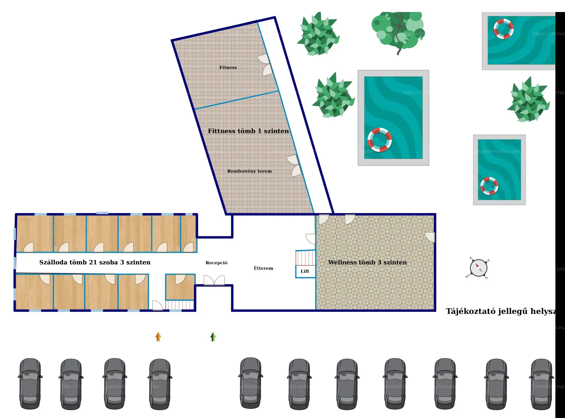 21 szoba 3 szinten, többnyire akadálymentes megközelítéssel