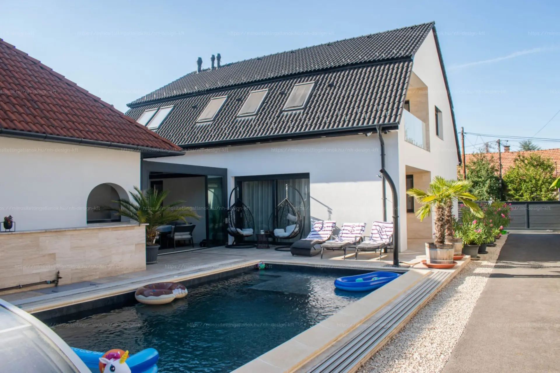 A gondozott, átgondolt, harmonikus KERT és a fűthető, fedett, ellenáramoltatóval felszerelt MEDENCE garantálja a teljes kikapcsolódást a fárasztó hétköznapokat követően.