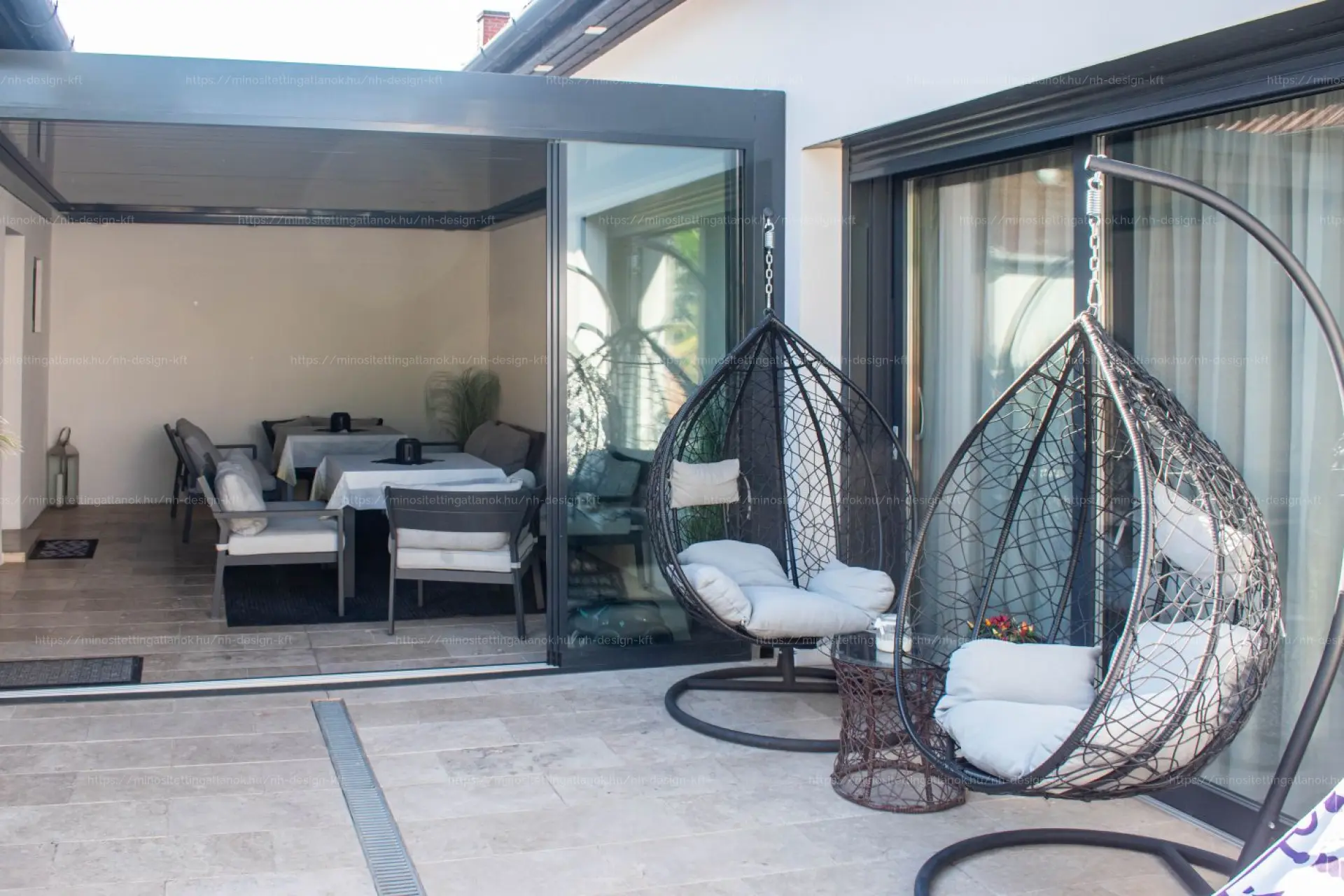 A nappaliból közvetlen kapcsolat vezet a 26 m²-es, bioklimatikus pergolás teraszra, amely egész évben használható élettér – tökéletes helyszín étkezésekhez, pihenéshez vagy vendégfogadáshoz.