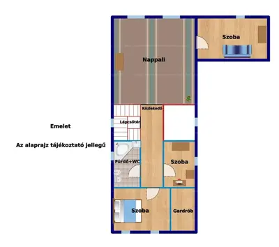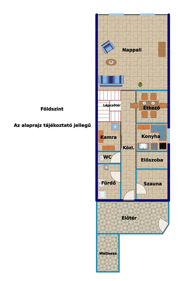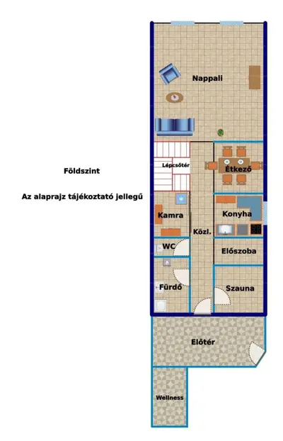 Ez a 200 nm-es két szintes otthon egy amerikai konyhás nappaliból, 2 fürdőből és 4 szobából, plusz a wellness részből áll.