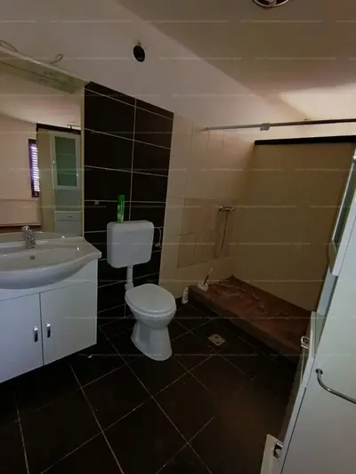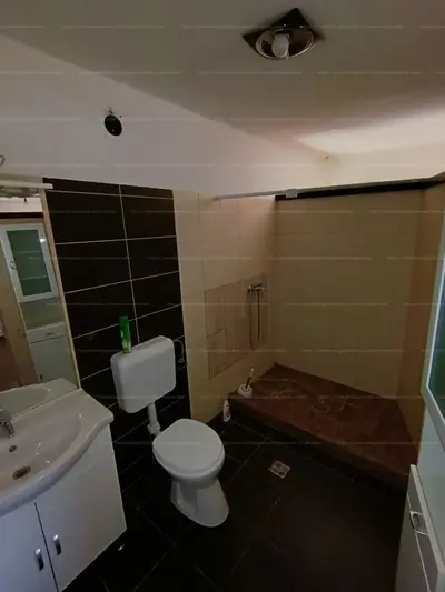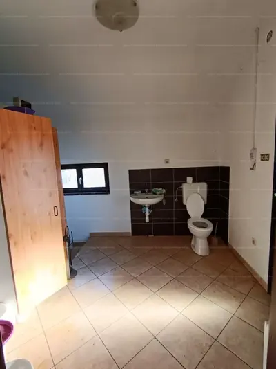 A hálószobához térelválasztóval kialakított fürdőszobai rész kapcslolódik. Melegburkolat a hálószobában. Többi helyiségben hidegburkolat található. Prémium Bordeaux fenyő nyilászárók, venge színű, egyedi tervezésűek.