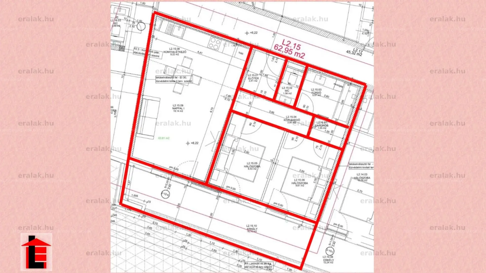 A 2. szinten lévő lakás nettó 62,95 nm melyhez egy 15 nm-es erkély tartozi. Amerikai konyhás nappalival és KÉT hálószobával.