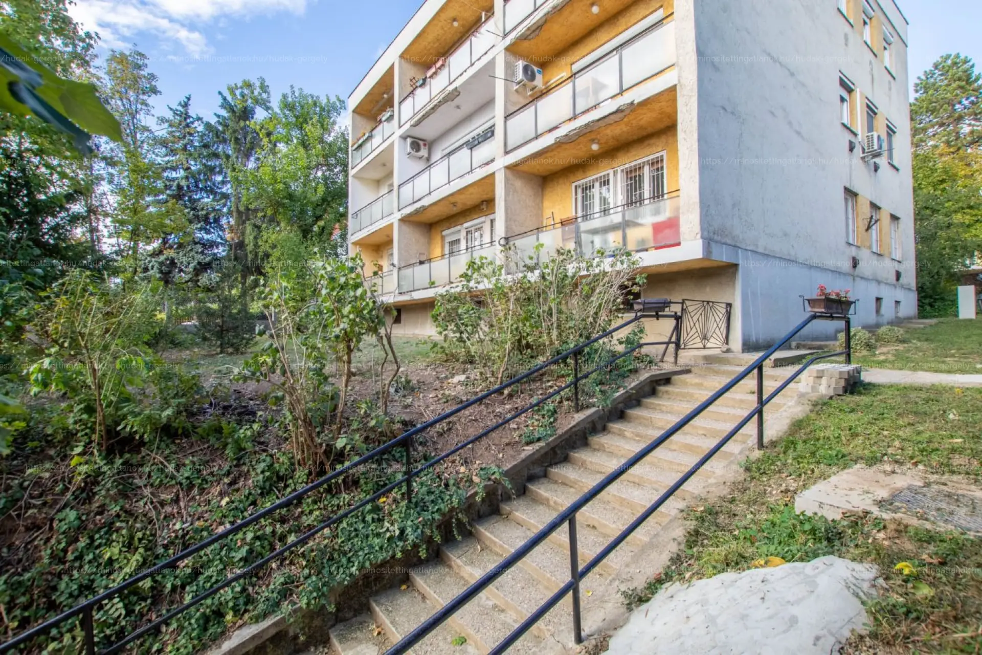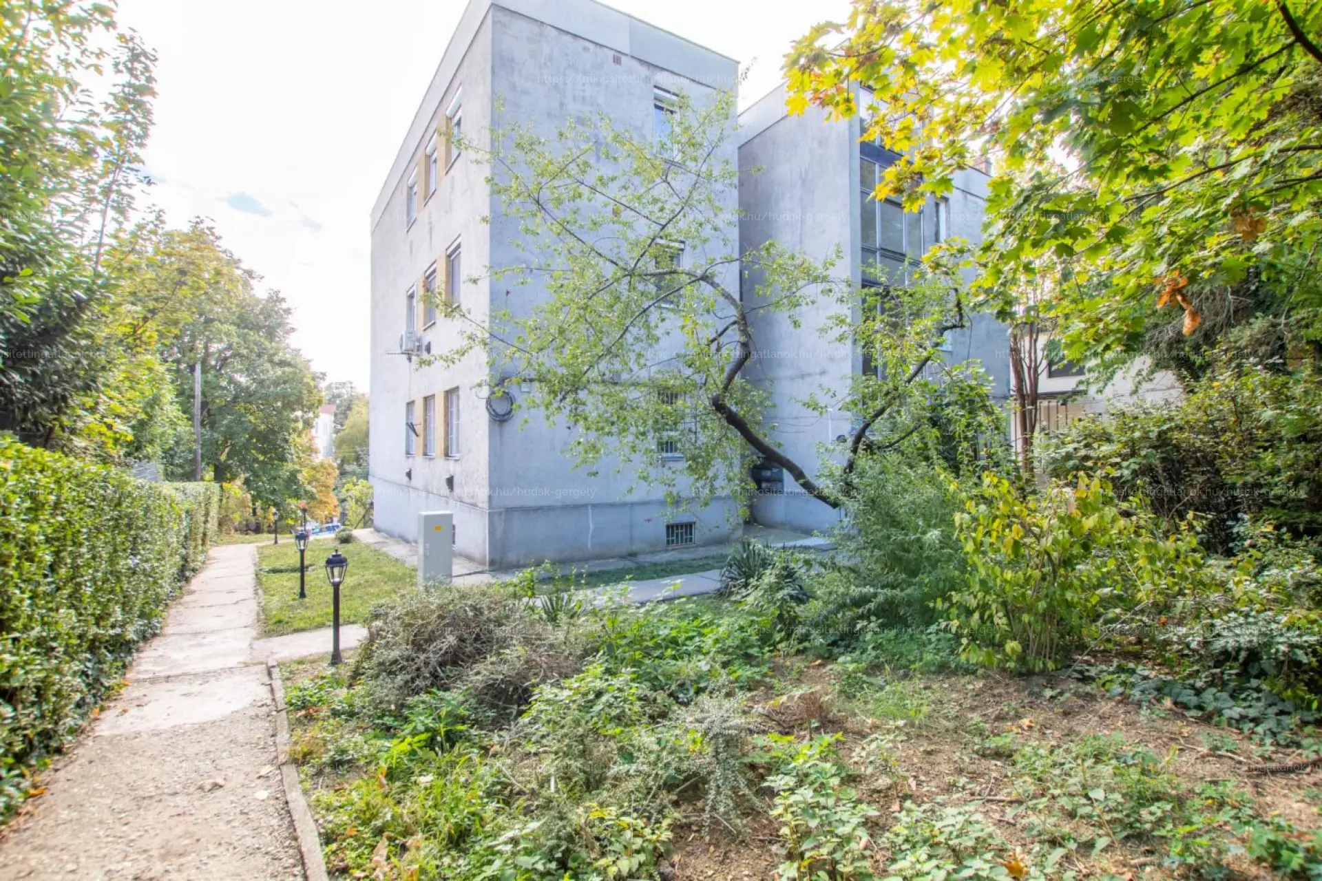A társasház a 70- es években épült, parkos környezetben, a terepviszonyoknak megfelelően lankásan emelkedő, ősfás telken.