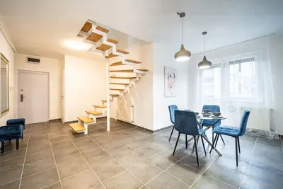 Belvárosi, mégis NYUGODT környezetben, 7 lakásos, RENDEZETT társasház 3. emeletén eladó egy TÁGAS, VILÁGOS, BELSŐ KÉTSZINTES otthon, garázzsal.