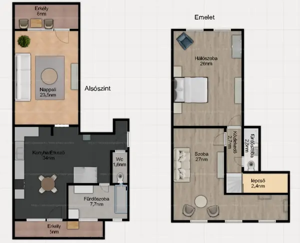 - Alsó szint (67 m²): nappali, konyha-étkező, KÁDAS fürdőszoba, külön WC + 2 ERKÉLY (összesen 11 m²)