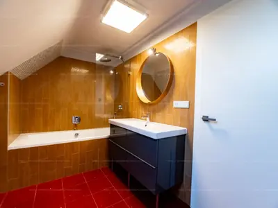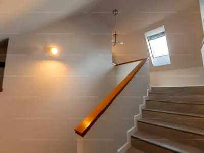 Az alsó szinten egy megfelelő méretű nappali-konyha-étkezős egység kapott helyet, közvetlen teraszkapcsolattal, míg a fent található, magán szinten három tágas hálószoba, kettő fürdőszoba és toalett szolgálja a kényelmet.