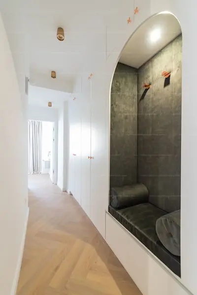 A lakás sarki elhelyezkedésének és az átgondolt felújításnak köszönhetően rendkívül világos, tágas hatást kelt.