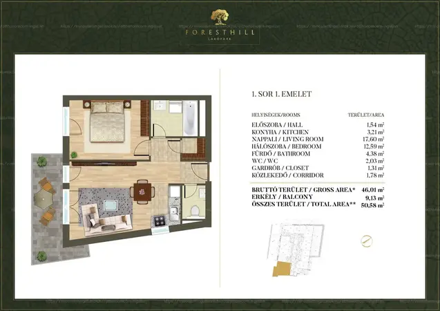 •Elrendezés: nappali + 1 hálószoba, amerikai konyha, háztartási helyiség