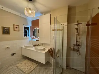 Az okos tervezésnek köszönhetően a szobák egymástól elszeparáltak A fürdőszoba jól átgondolt tervezésnek köszönhetően tágas, jól szellőztethető, dupla mosdós, különleges, mint a lakás többi helyisége.
