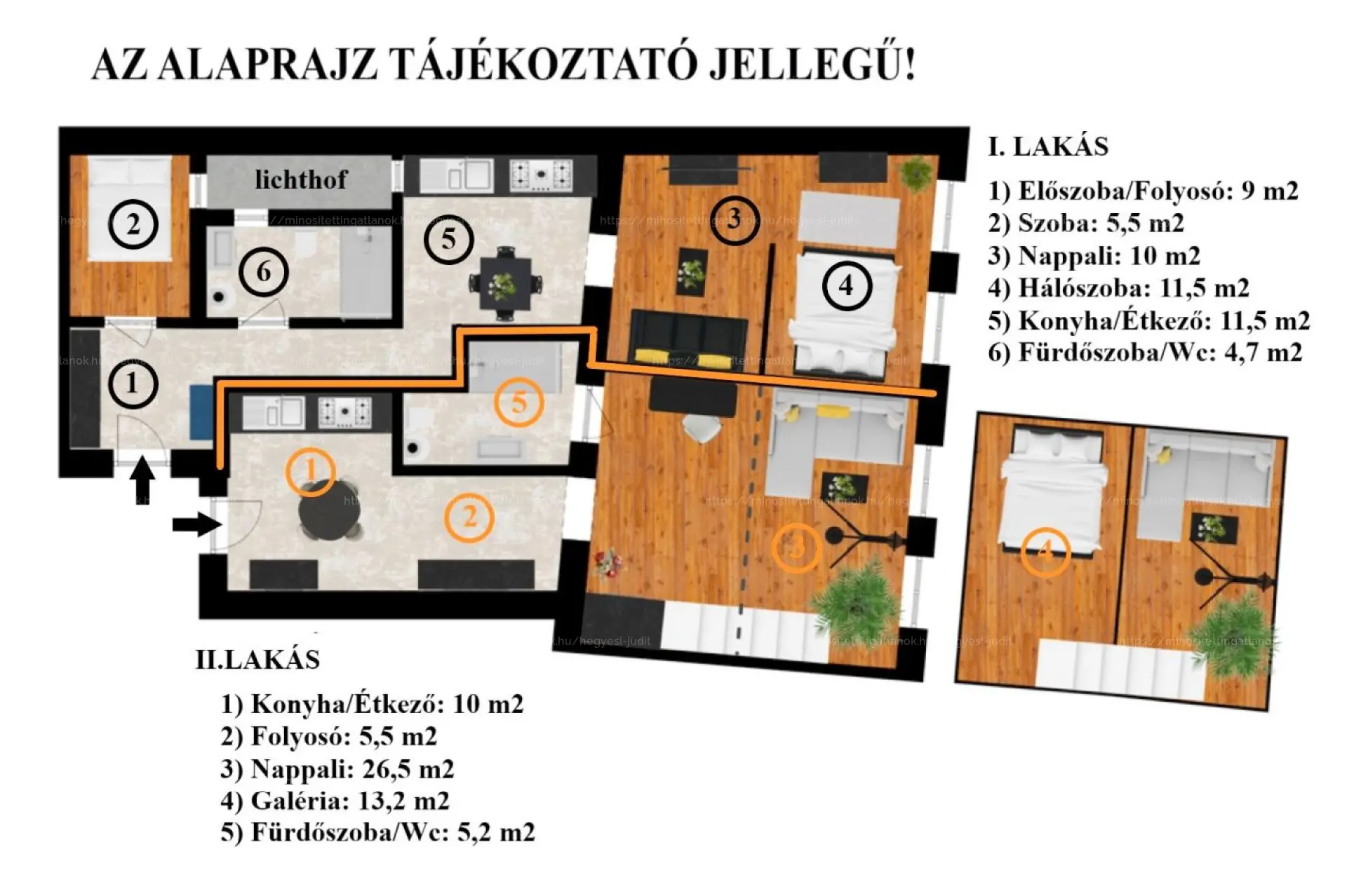 A Leonardo da Vinci utcában található, 98 m²-es, 1. emeleti lakás teljeskörű felújításon esett át, és két külön mérőórás, engedéllyel rendelkező lakás lett kialakítva (52,5 és 47,3 m² + galéria).