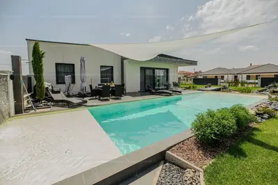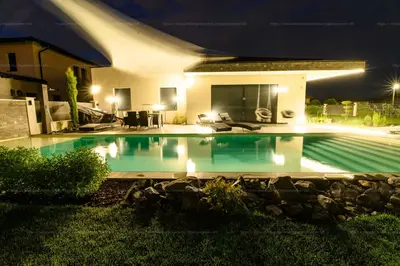 15×4 m-es úszómedence épített vízeséssel és LED-világítással