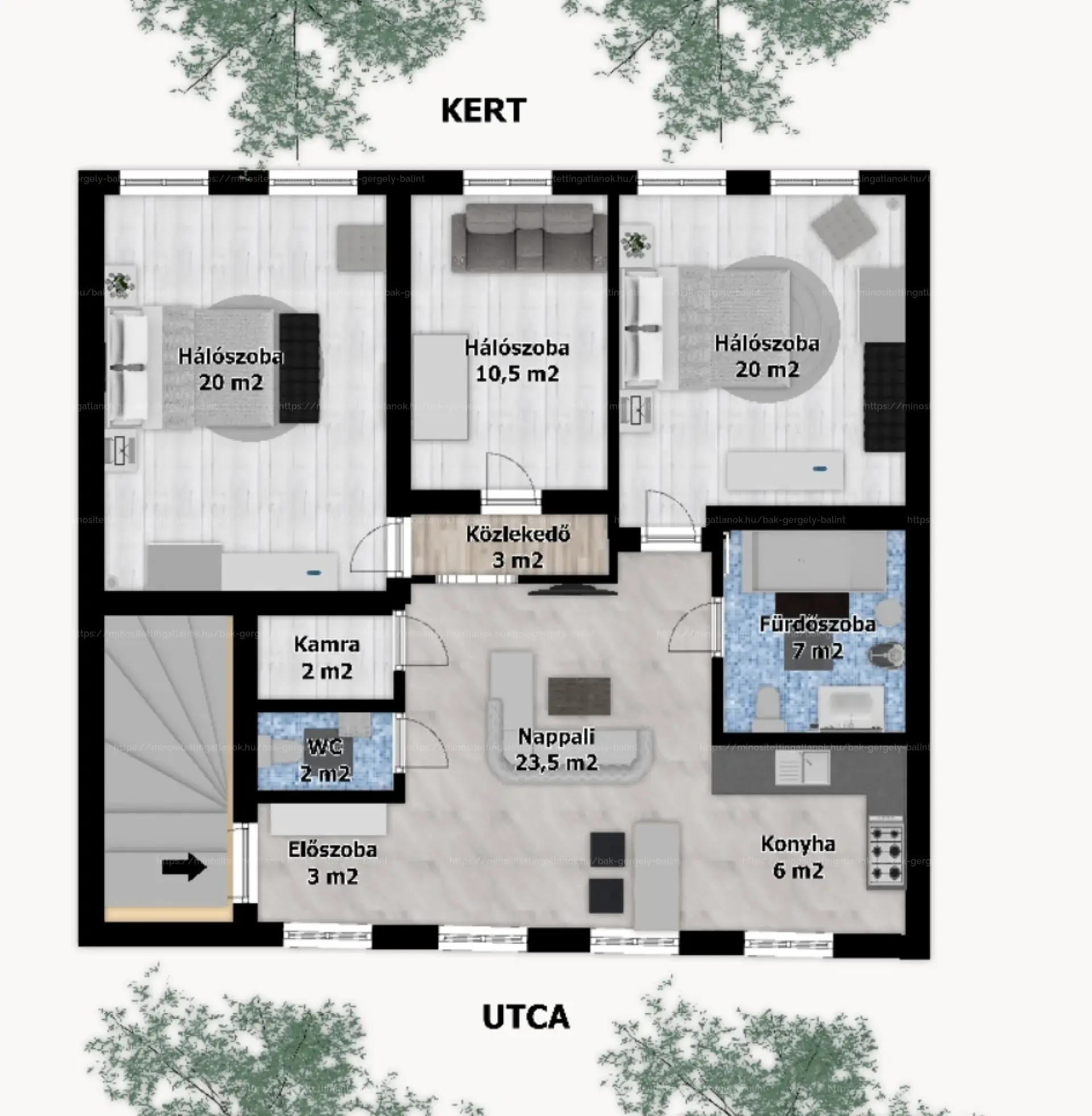 A nappali és a konyha az előkert felé nyílik, míg a hálószobák a keleti tájolású, intim hátsó kertre néznek – garantálva a csendet és a természetes fényt.