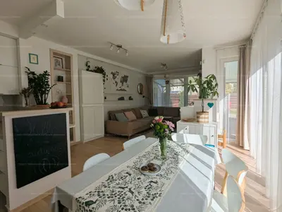 A két szintes, kb. 120 m²-es otthon kiváló elosztású: tágas amerikai konyhás nappali, összesen 3 +2 félszobás, 2 fürdő, gardrób, két terasz, valamint egy kizárólagos használatú, parkosított kert tartozik hozzá. Az ingatlan jogi jellege: társasház!