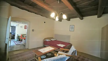 Ez az 1900-ban épült, stabil és erős falazatú kőház egy gondosan karbantartott, enyhén lankás, 3350 m²-es telken fekszik, melynek rendezett udvarára egy hátsó utcából lehet gépjárművel behajtani. A ház meleg hangulatát a kiváló állapotú fagerendás mennyezet adja.