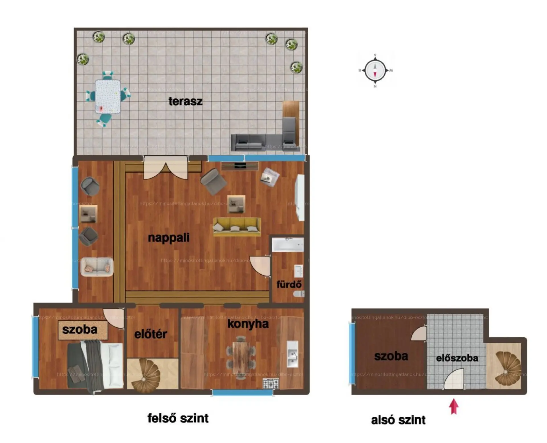A nappali + két hálószobás elrendezéshez egy impozáns, 40 m²-es, D-i tájolású terasz is tartozik ideális hely a nyugalom és a kilátás élvezetére.