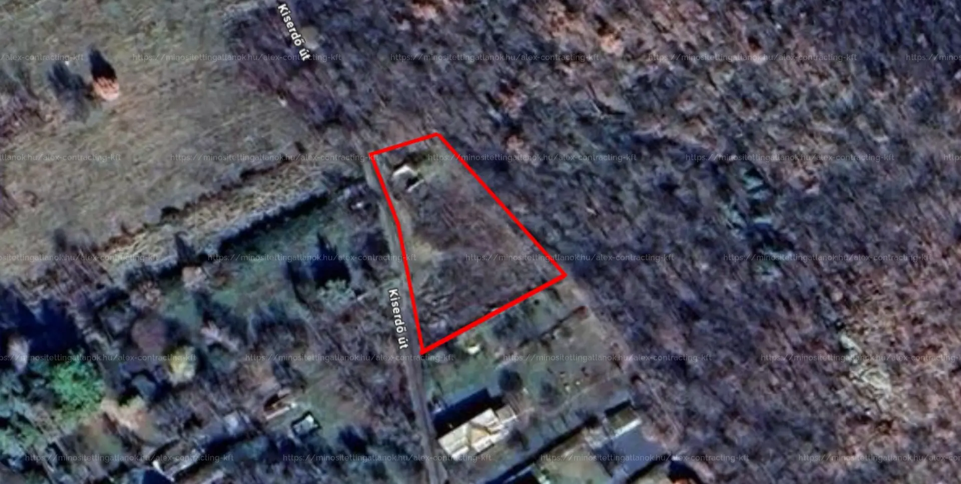 A telek végső, szélső telek, felső részén már az erdő határolja, az alsó részén szomszédságban épület, és az aszfaltos Kiserdő utca határolja.