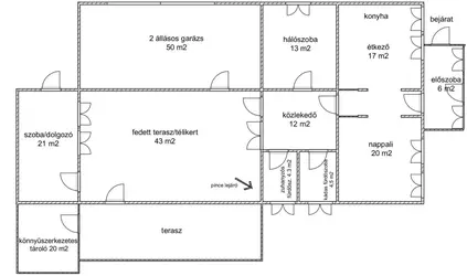 Központi tere a tágas amerikai konyhás nappali, modern konyhával. Ezen túl előszoba, közlekedő, egy kádas és egy zuhanyzós fürdőszoba, valamint hálószoba alkotja a főépületet. Folytatásában igazán sokrétűen kihasználható 43 m2-es fedett terasz lett kialakítva jakuzzival. Innen nyílik egy jelenleg dolgozónak használt, az utcai udvar rész felől önállóan is megközelíthető szoba, valamint egy 9 m2-es száraz pince. Kényelmes beállást biztosító kétállásos garázs szolgál az autók tárolására, mely a lakás felől is megközelíthető.