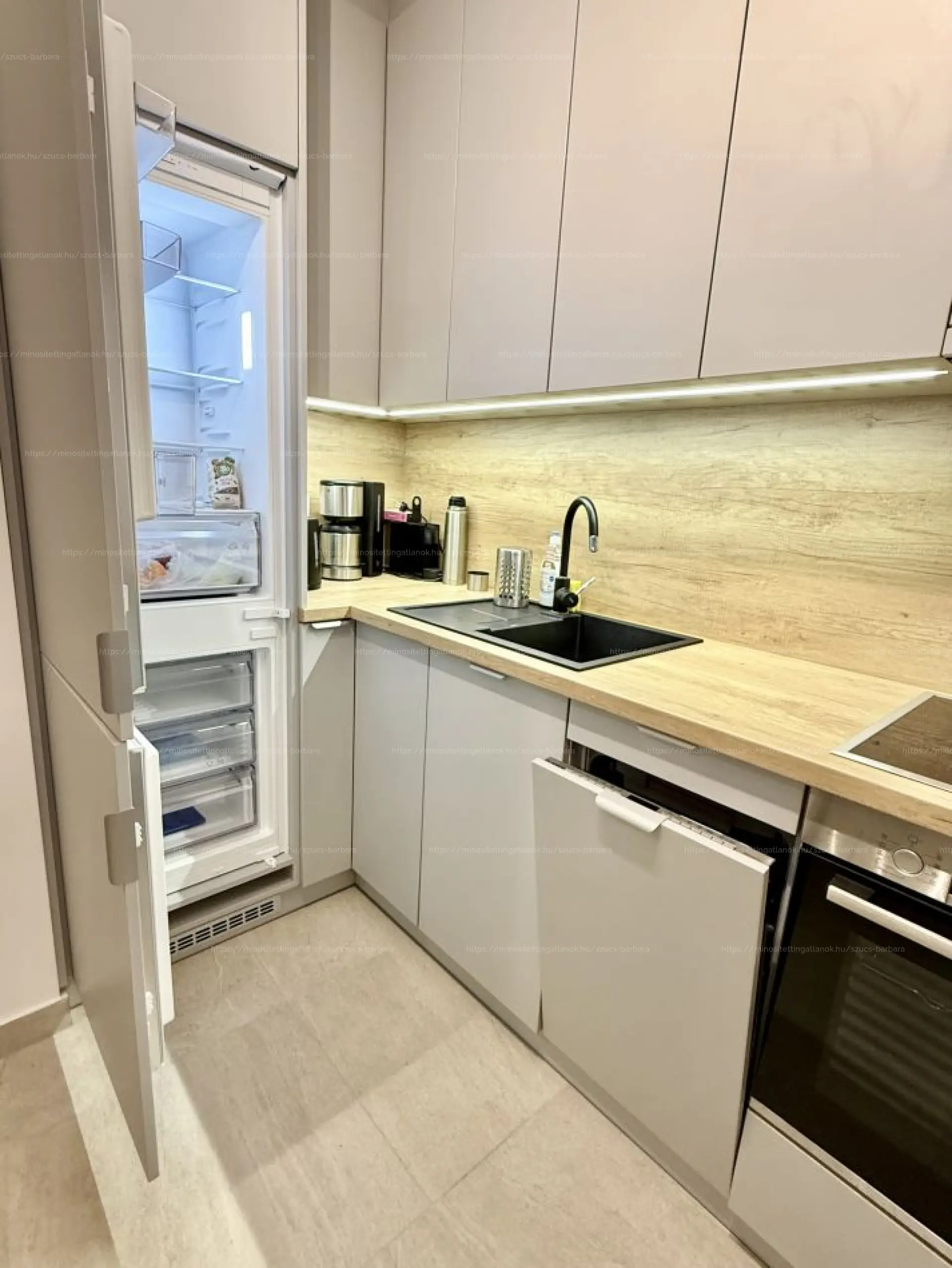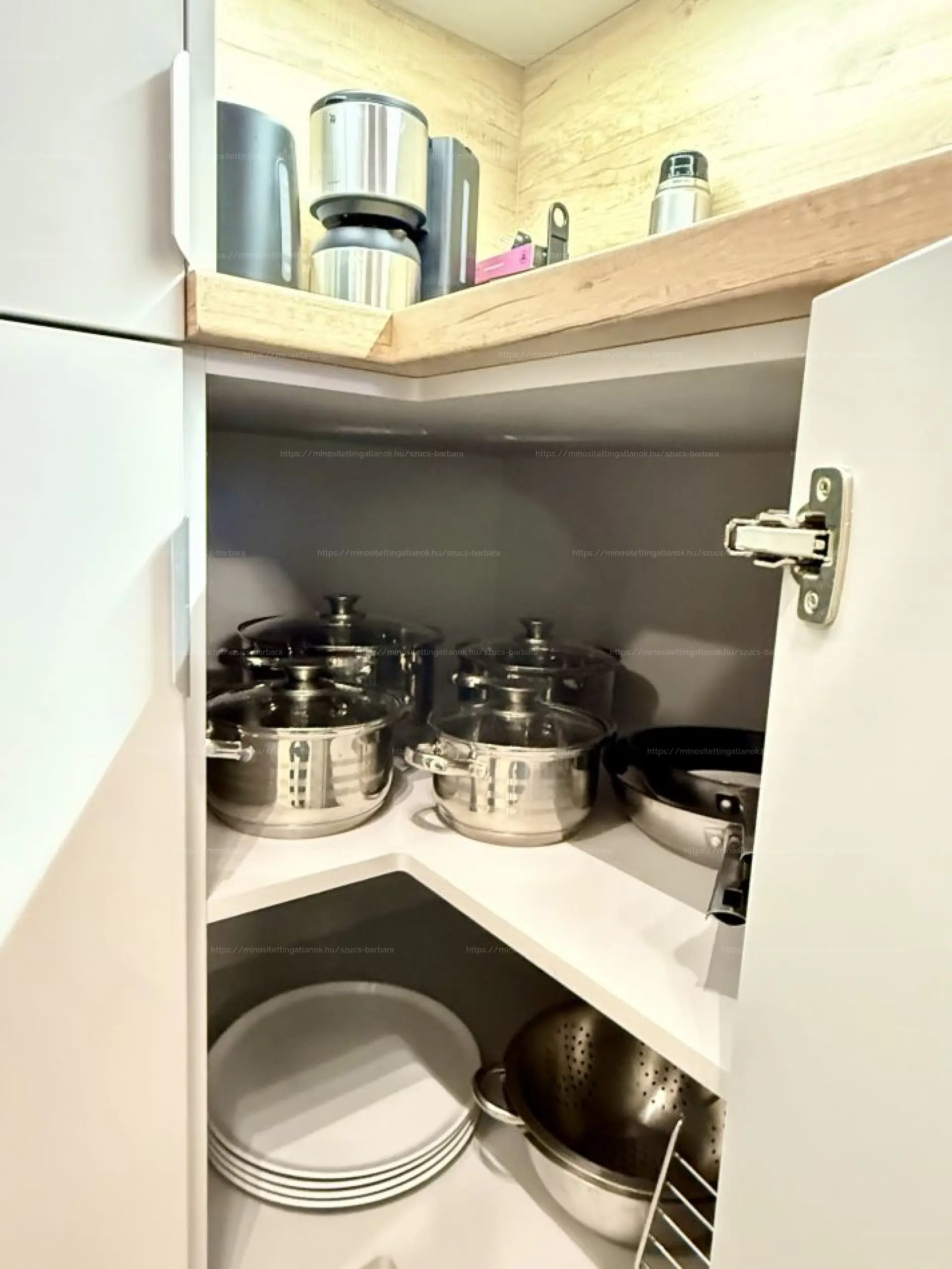 A konyha is teljesen gépesített (indukciós főzőlap, elektromos sütő, kivezetett szagelszívó, mosogatógép, fagyasztós hűtő, vízforraló, mikró) és felszerelt (főzéshez szükséges eszközök, tányérok, poharak, evőeszközök...stb). A kádas fürdőszobában található az új szárítós mosógép.