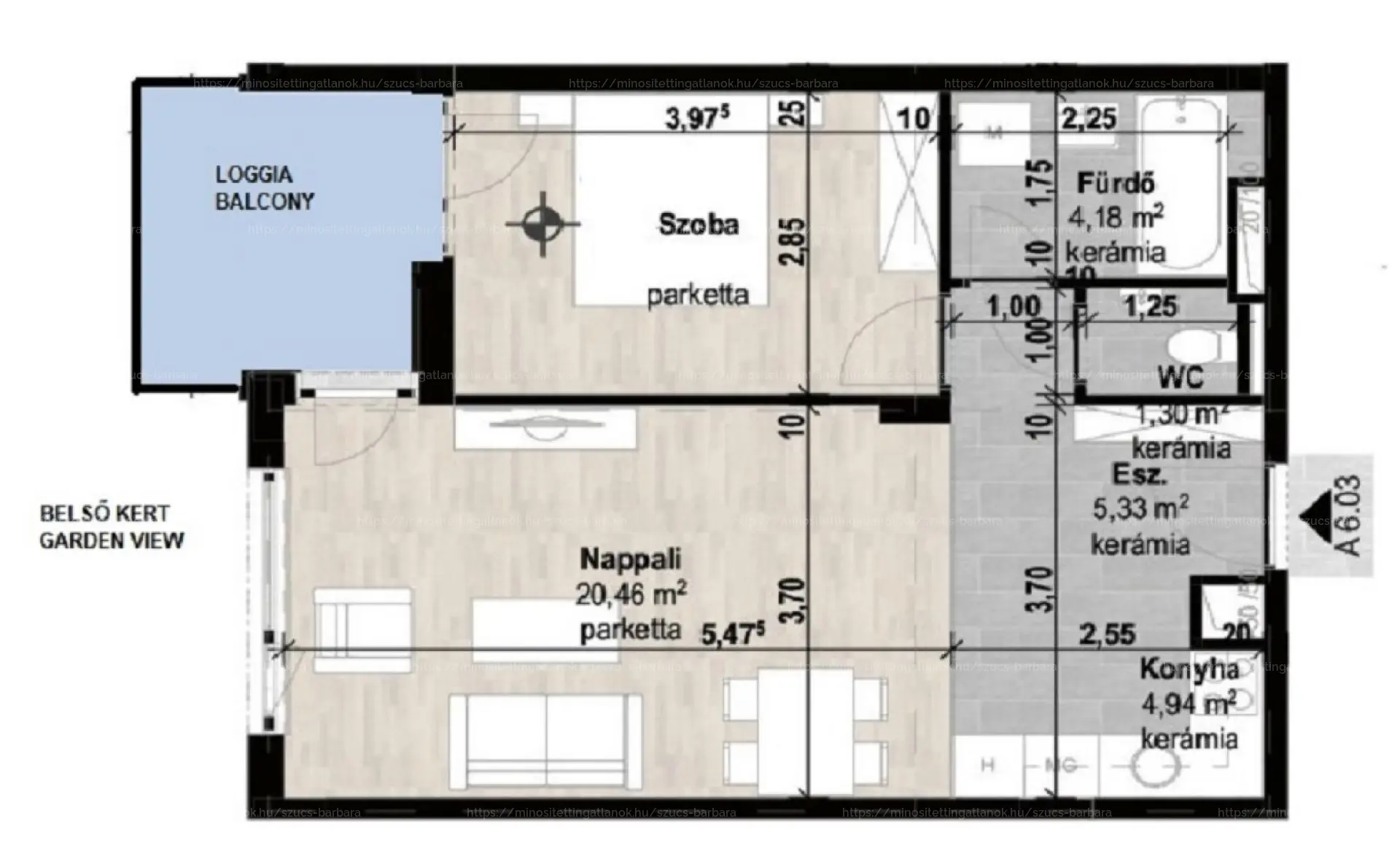 A lakás beosztása nagyon jó: az amerikai konyhás nappaliból és a hálószobából is kijárattal egy kényelmes, körben védett loggiára. Az ablakok elektromos redőnyökkel felszereltek.