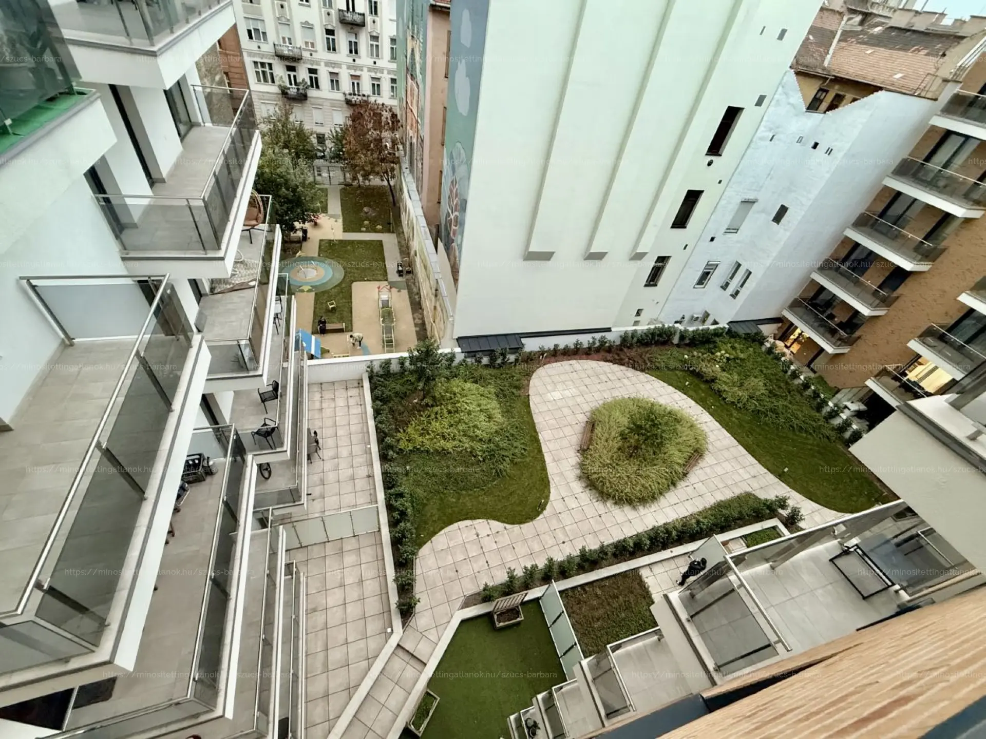 KIADÓ a VIII.Víg utcában egy ÚJ ÉPÍTÉSŰ ÖKOHÁZ-ban egy 6. emeleti, újonnan berendezett és gépesített 50 m2-es + 6,5 m2 loggiás, 2 szobás, csendes és napos, a házak közti belső kertre néző lakás.