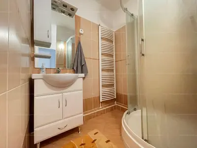 A wc és a zuhanykabinos fürdő egy helységben található.