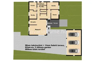 A 96 nm lakótér kiegészül 14nm-es fedett terasszal és 62nm-es, 3 beállásos garázzsal.