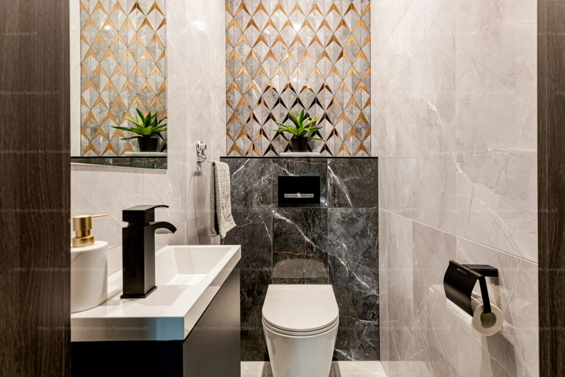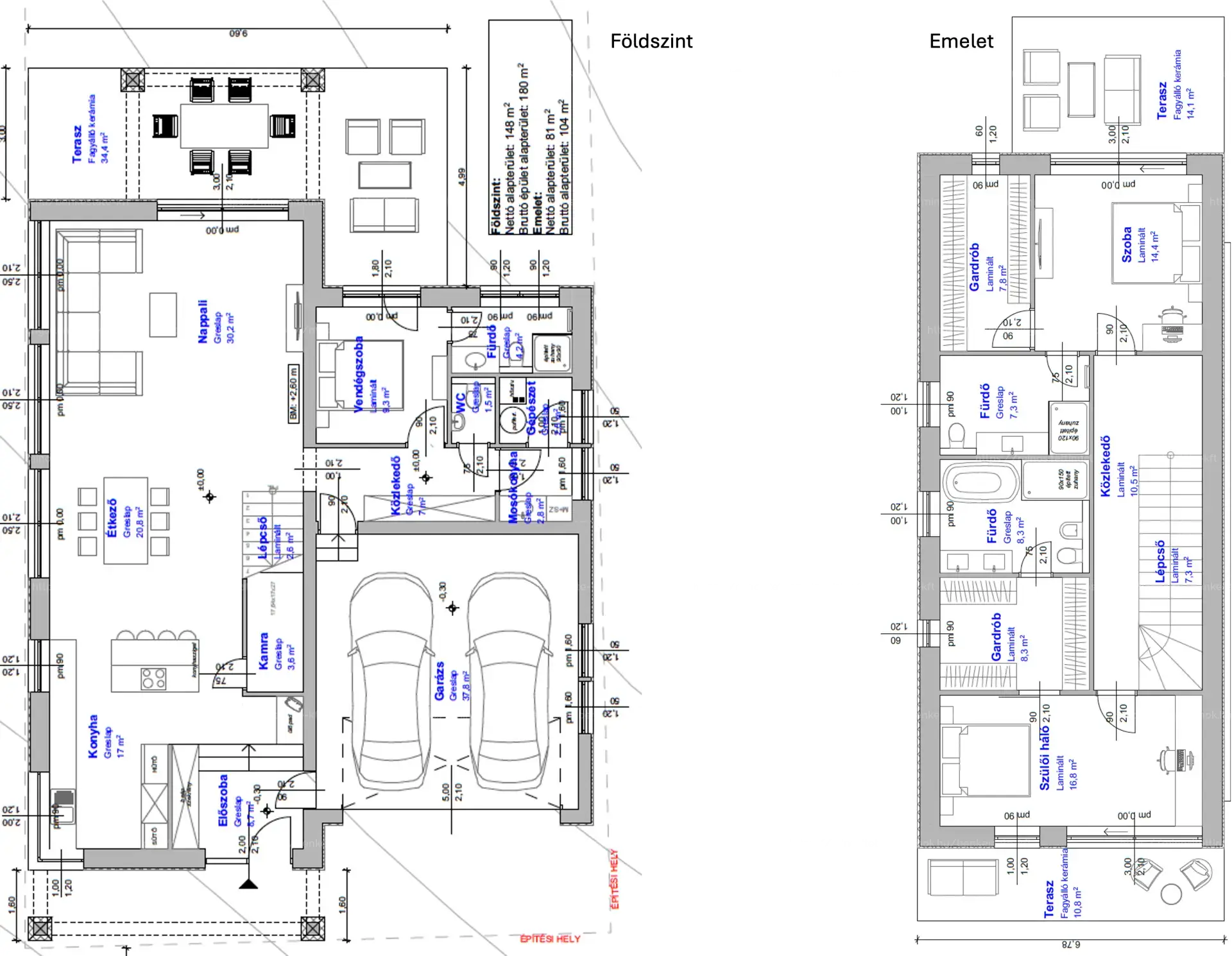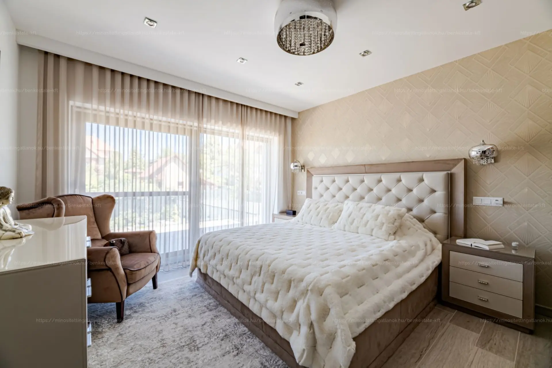 A parkosított telken fekvő nettó 229nm-es lakótérrel rendelkező ház földszintje 148nm (előszoba, konyha-étkező, nappali, vendégszoba saját fürdővel, külön wc, kamra, mosókonyha, gépház, garázs + 34nm nappali és kertkapcsolatos pihenő terasz), emelete 81nm (2 tágas hálószoba, mindkettő saját fürdővel, saját walk-in gardróbbal, saját panorámaerkéllyel).