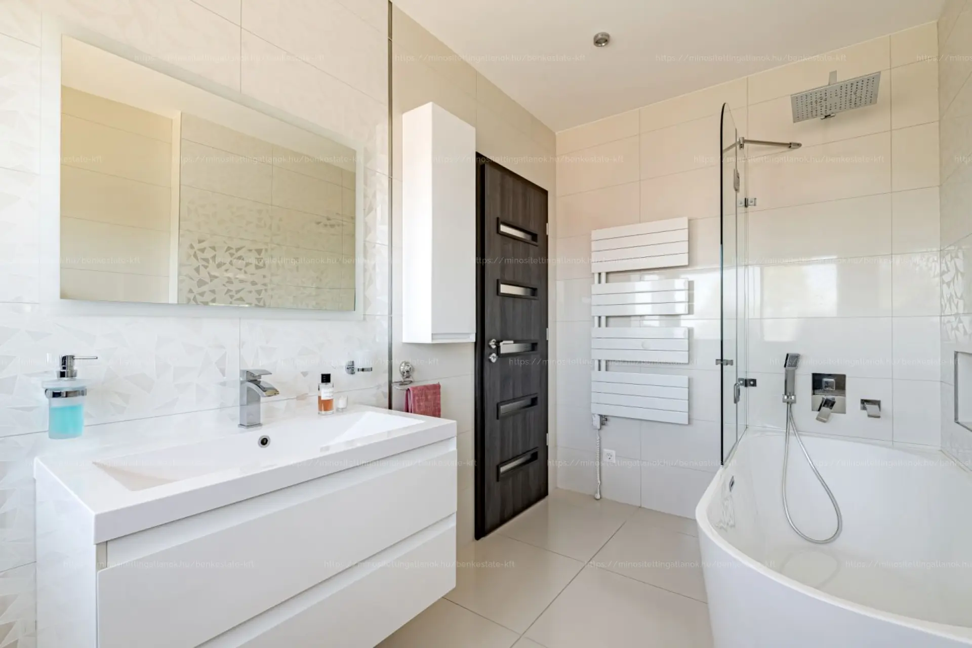 A házat kiváló referenciákkal rendelkező, nagy múltú kivitelező cég építette masszív alapokra, 44cm-es falai 5cm-es grafitos szigetelést kaptak, hőtartása kiváló, az energiatakarékos hőszivattyúval vezérelt padlófűtés és padló hűtés minden helyiségben külön-külön szabályozható, a napelemeknek hála fenntartása szinte 0 Ft.