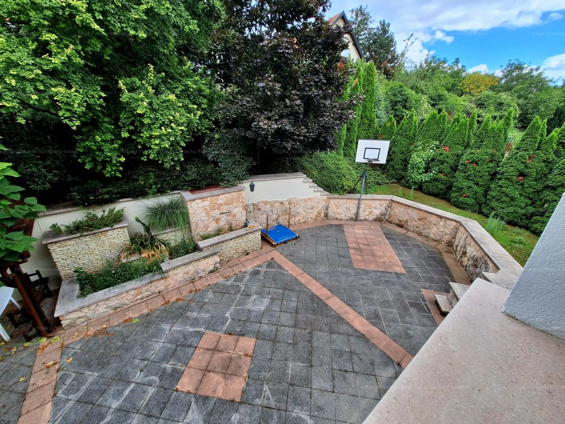 Az automata öntözőrendszerrel ellátott kertben gondozott gyep, térkőburkolatok, örökzöldek és színpompás virágok teszik igazán különlegessé a környezetet.